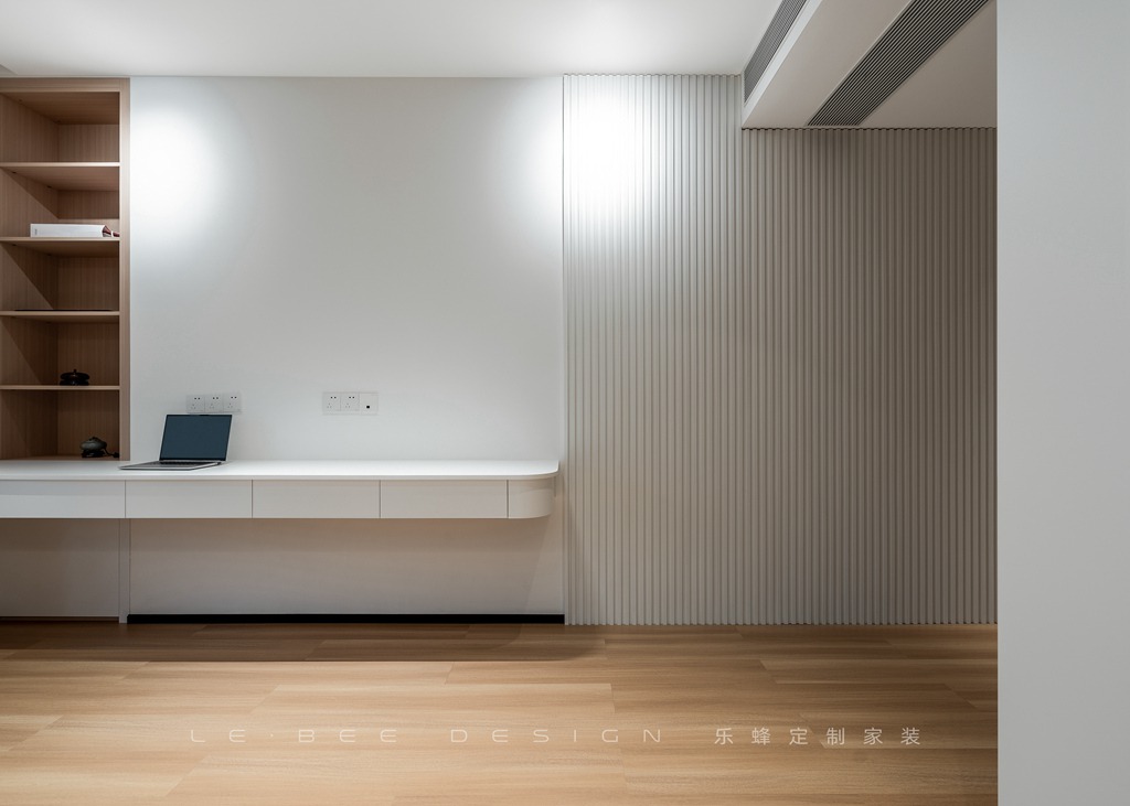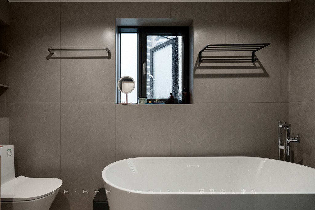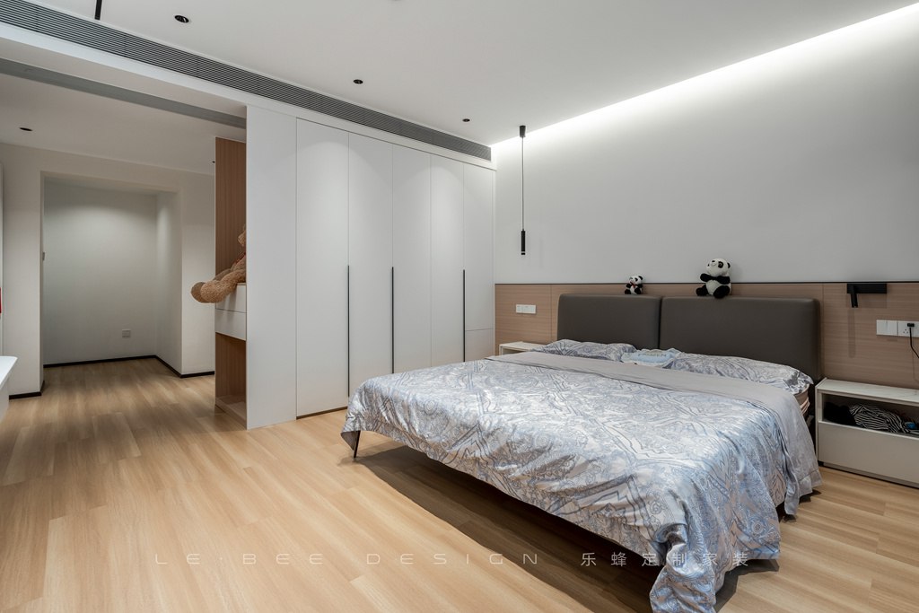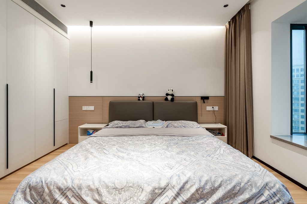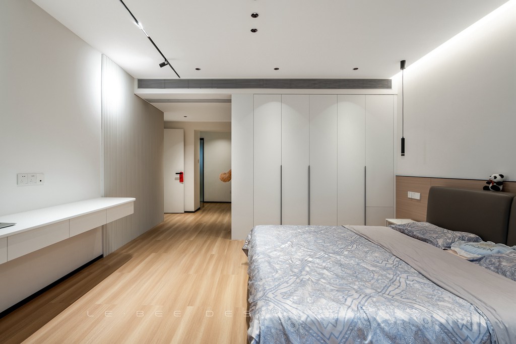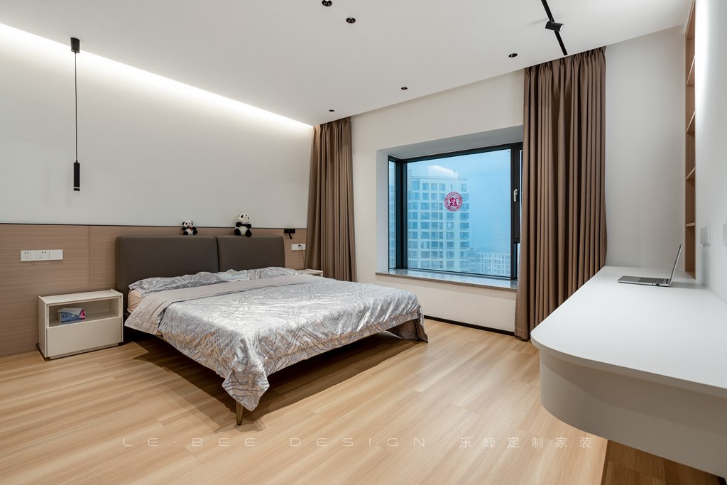 主臥采用原木地板鋪設(shè),床頭采用原木硬包設(shè)計,兩側(cè)床頭配有插孔和開關(guān)燈按鈕,方便業(yè)主日常生活。窗簾隱藏式軌道,飄窗設(shè)計增加了功能。懸浮的辦公桌提供了一個舒適的辦公空間。木格柵和其他設(shè)計使空間更加豐富多樣。主衛(wèi)主要采用灰色為主,干濕分離的設(shè)計配置了大浴缸,安裝排氣裝置保證安全。