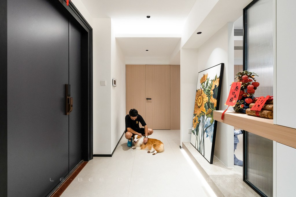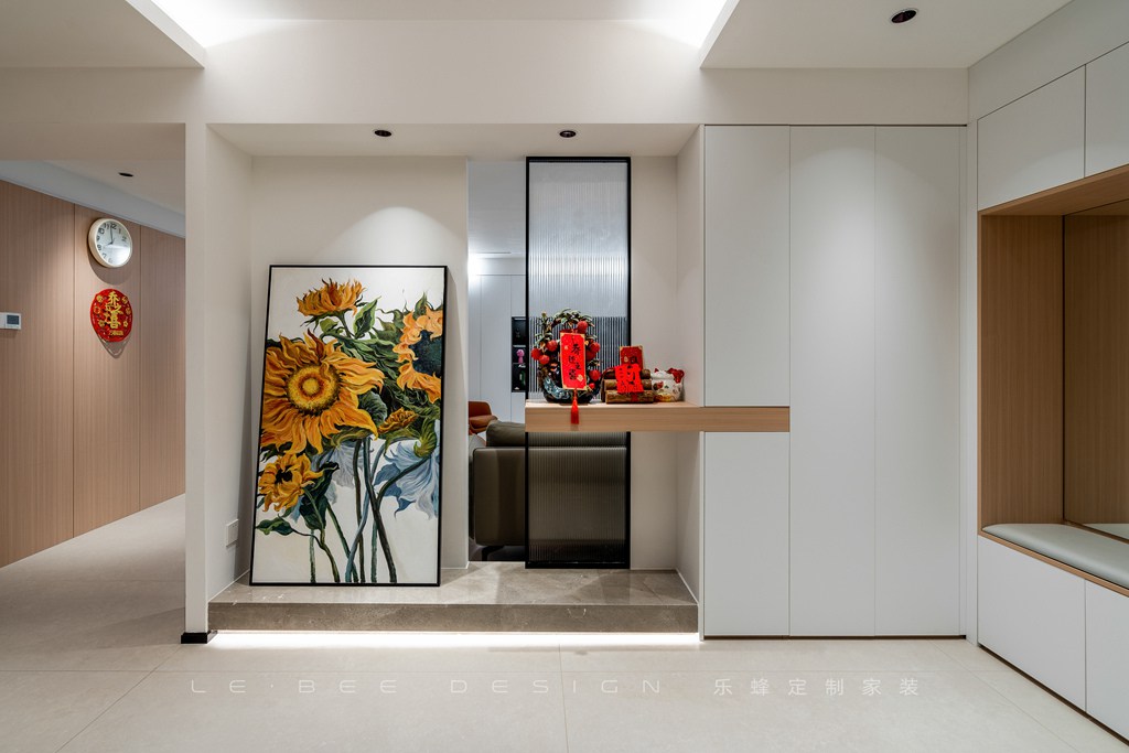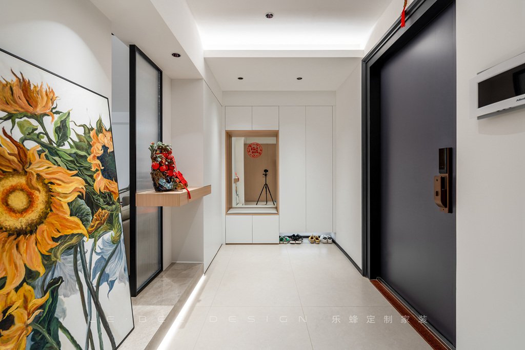 黑色的入戶門宛如一道氣勢非凡的屏風(fēng),猶如一幅喜慶盈門、向陽的向日葵畫,為家中增添了喜慶的氛圍。入戶玄關(guān)設(shè)計的凹槽則像是一個溫馨的迎賓者,衣帽柜內(nèi)嵌的換鞋凳讓回家后可以輕松地更換鞋子,方便又整潔。