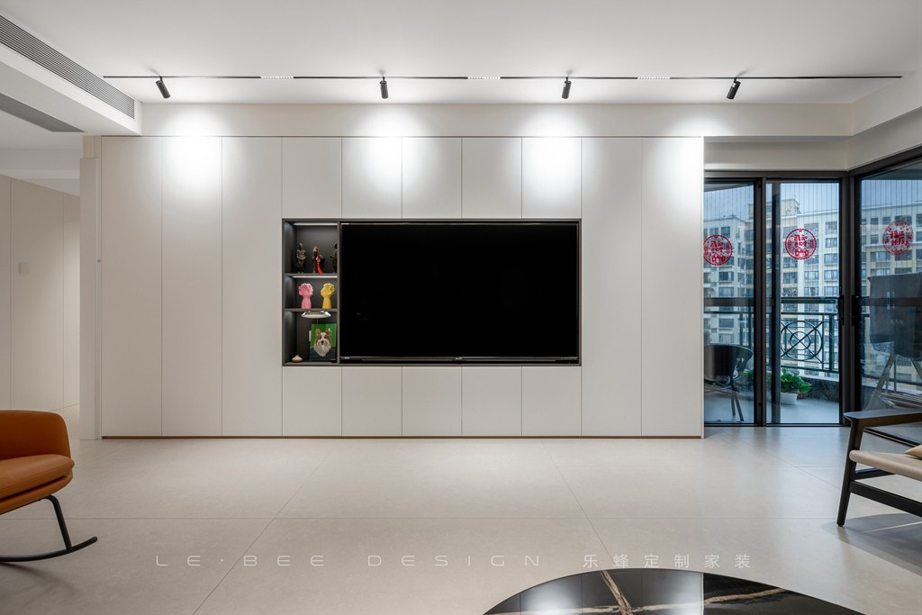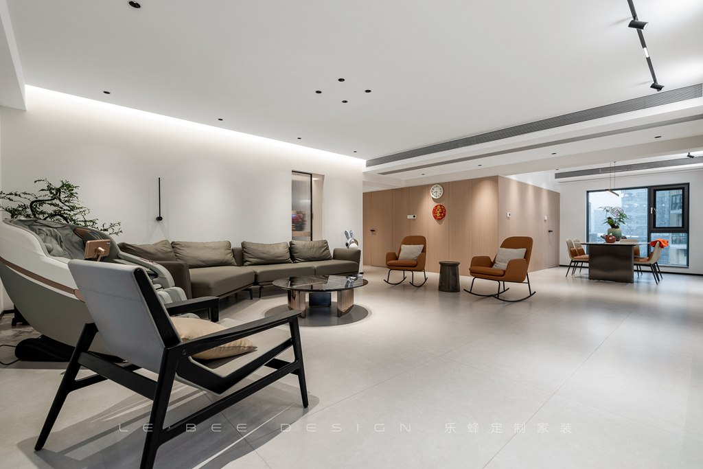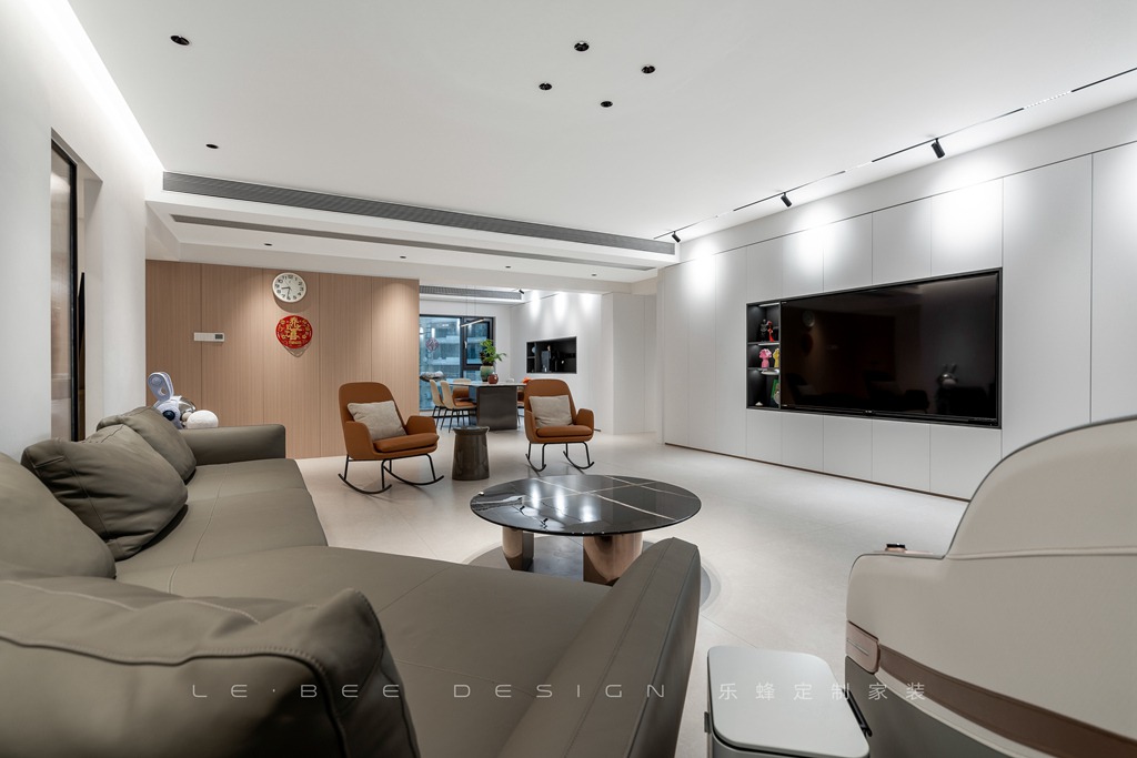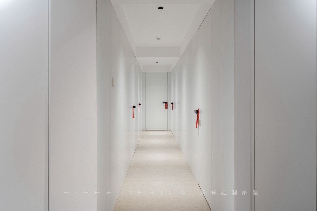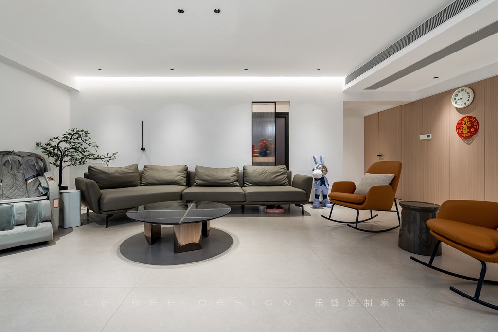 客廳采用大平頂設(shè)計,并利用線燈和射燈為其提供簡約而溫馨的照明,營造出宜人的氛圍。電視墻做成滿墻的電視柜,方便收納電視,整體看起來更加簡約。沙發(fā)區(qū)設(shè)有一張簡單的黑色玻璃小茶幾和灰色的皮質(zhì)沙發(fā),沙發(fā)腳采用鐵質(zhì)設(shè)計,延長了沙發(fā)的使用壽命。背景墻簡約而不失溫馨,墻上的小壁燈為空間增添了溫馨感。杏色的單人椅與兩把奢華的愛馬仕橙皮搖椅相搭配,營造出大氣和悠閑的氛圍。兩側(cè)的綠植和兔子相互映襯,為空間增添生氣和生機。凈白的長長走廊如同一幅自然的畫卷,地板磚的通鋪使其看起來更加自然純粹。
