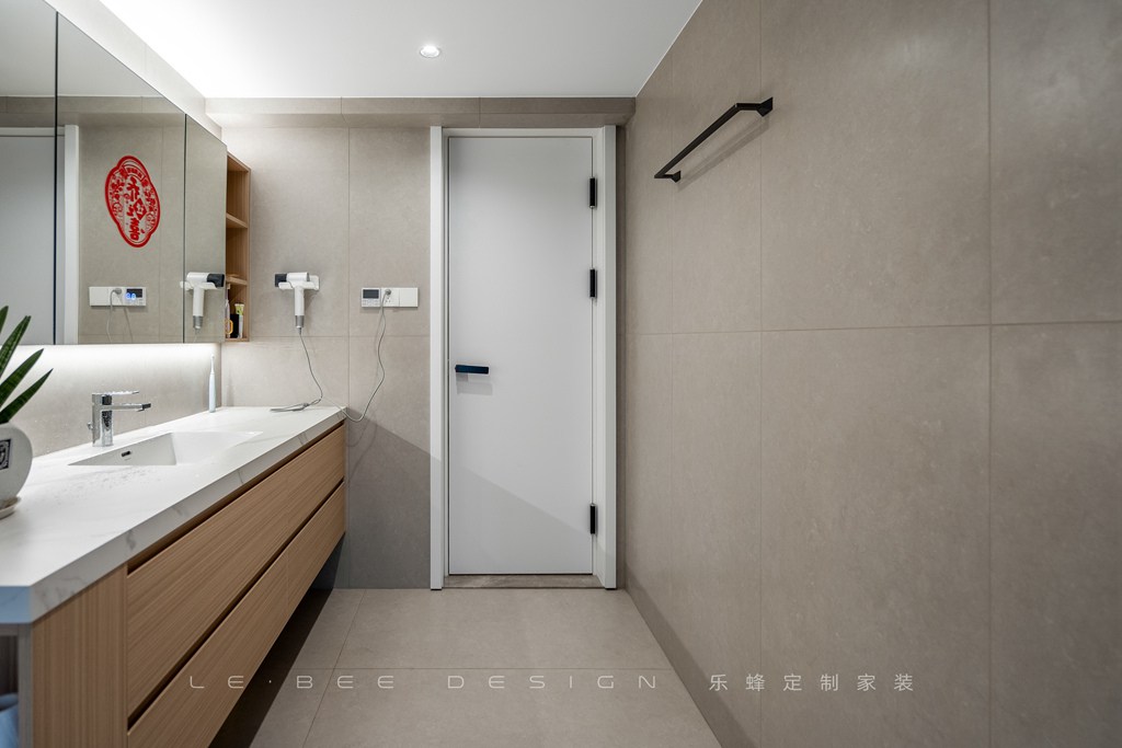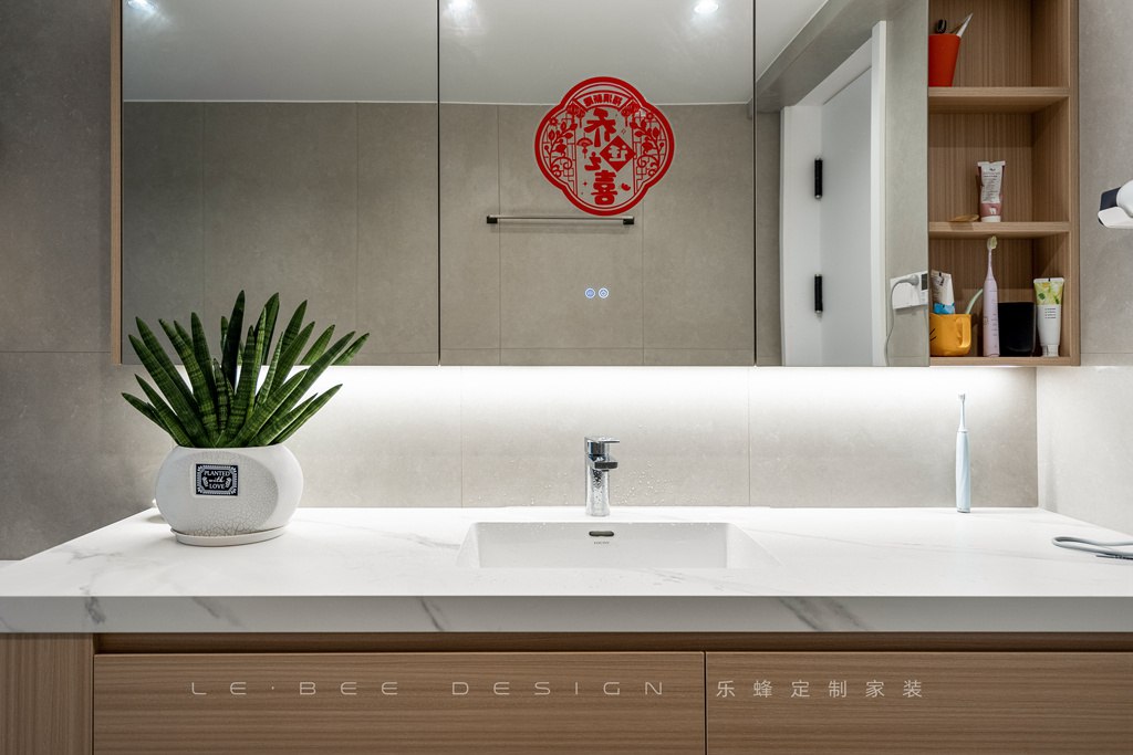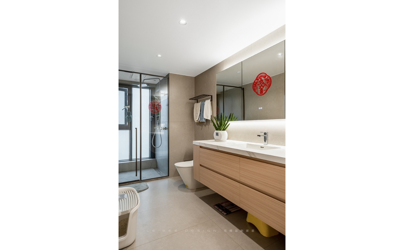 公衛(wèi)采用了原木設(shè)計的懸空洗漱柜和巖板洗漱臺,相得益彰,溫馨而簡約。鏡面柜的設(shè)計增加了收納空間。綠植陪伴使其更加生機勃勃。淋浴區(qū)設(shè)置了高低排水設(shè)計,解決了積水問題。防窺玻璃既不影響光線,又具有美觀和高級感。
