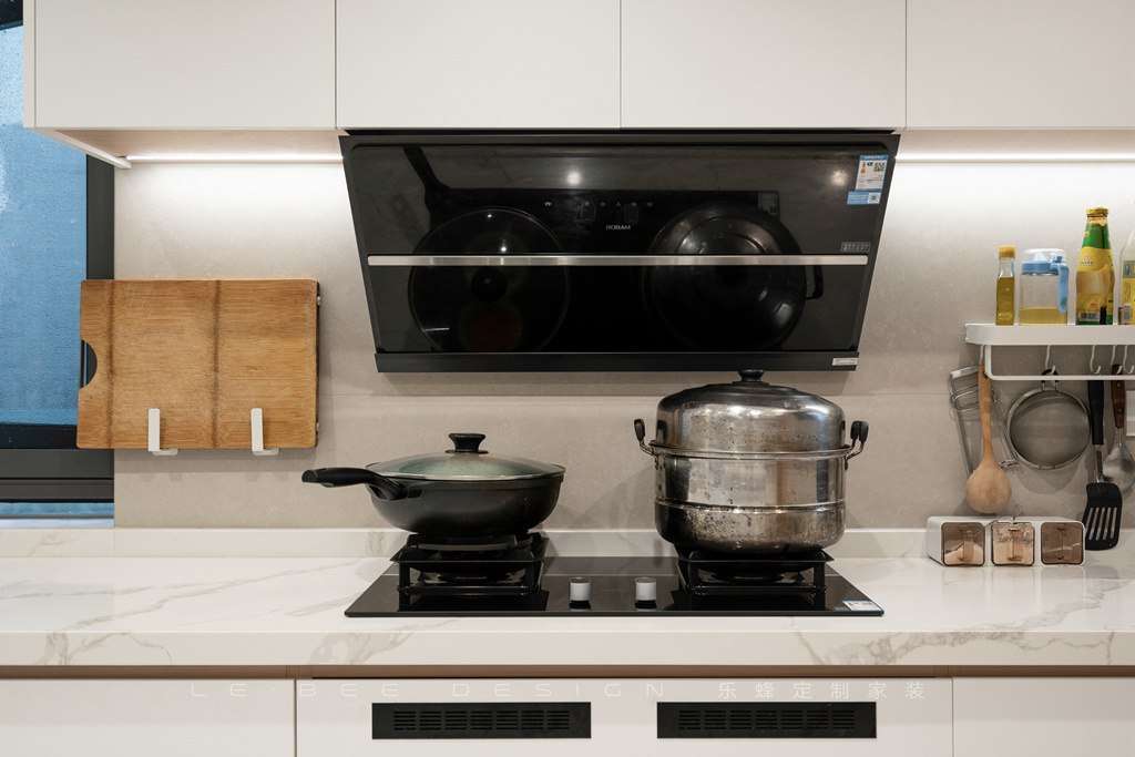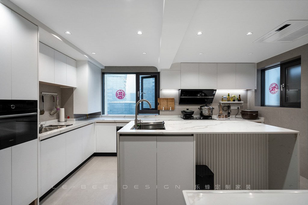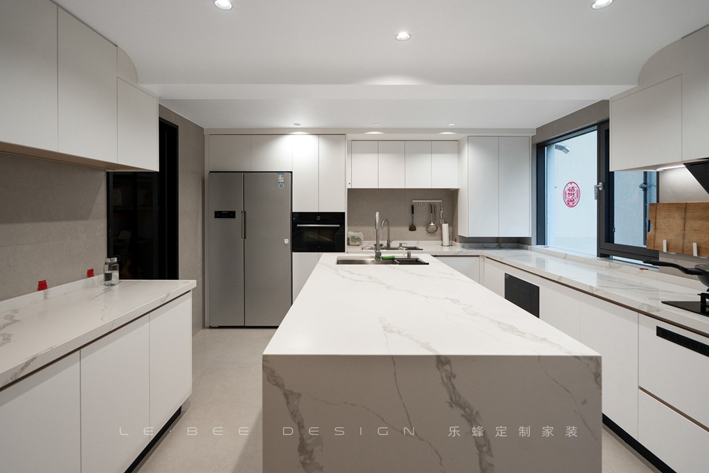 廚房采用了回形設(shè)計,兩扇門更方便進出。廚房區(qū)域分工明確,洗菜、烹飪、切菜和電器區(qū)域設(shè)置清晰,動線流暢。高低櫥柜設(shè)計,電器嵌入其中,簡潔明了。廚房采用了回形設(shè)計,兩扇門更方便進出。廚房區(qū)域分工明確,洗菜、烹飪、切菜和電器區(qū)域設(shè)置清晰,動線流暢。高低櫥柜設(shè)計,電器嵌入其中,簡潔明了。廚房還安裝有中央空調(diào),烹飪時也不會感到悶熱。島臺區(qū)域設(shè)計巖板臺面和水槽,讓功能更全面、使用更方便。留空處用格柵裝飾,增添了美感。