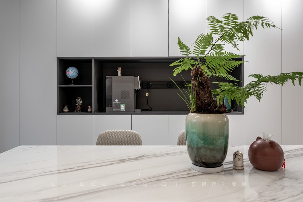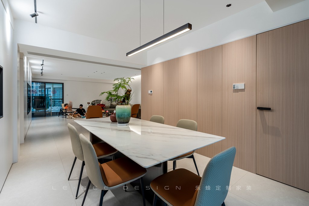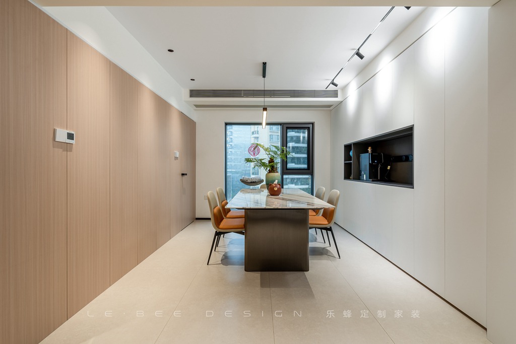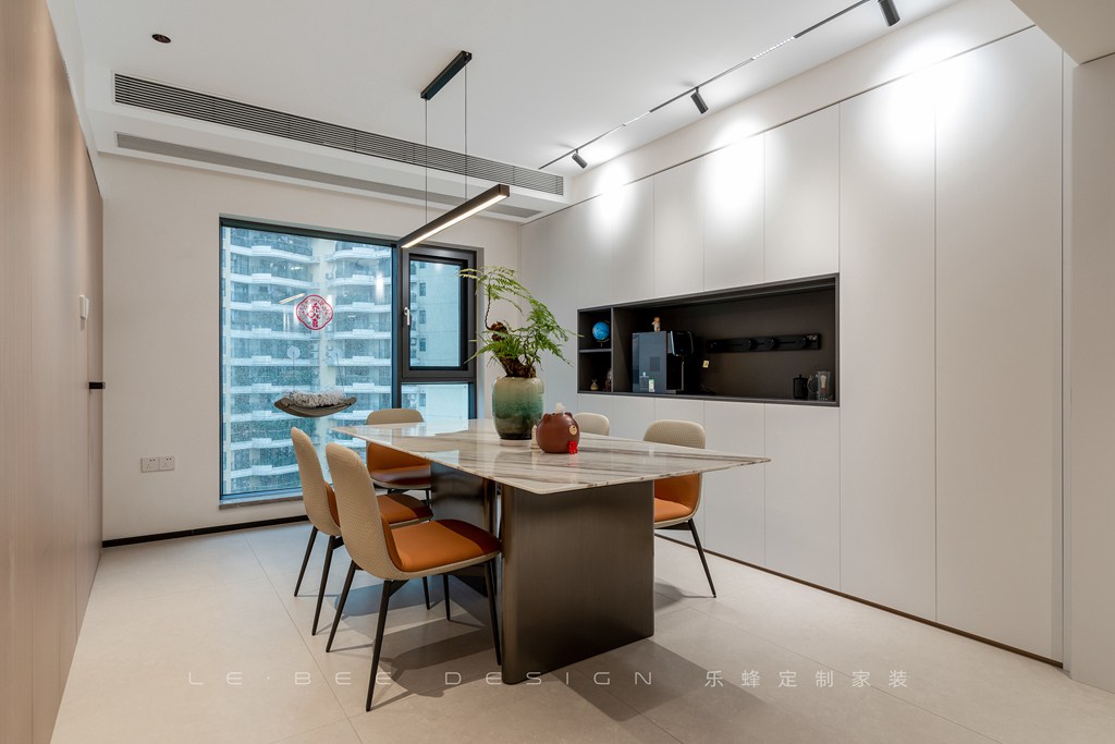餐廳采用巖板餐桌和橙色與灰白色的餐椅,綠色漸變的花盆里的綠植生機勃勃。餐廳采用巖板餐桌和橙色與灰白色的餐椅,綠色漸變的花盆里的綠植生機勃勃。吊燈采用長線設(shè)計,營造出溫馨的用餐氛圍。餐邊柜設(shè)計采用白色,方便收納餐具,中間留空的軌道插座安全實用,方便日常煮咖啡、燒水和充電等功能。