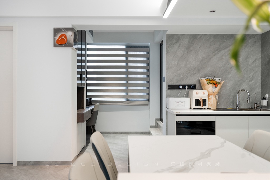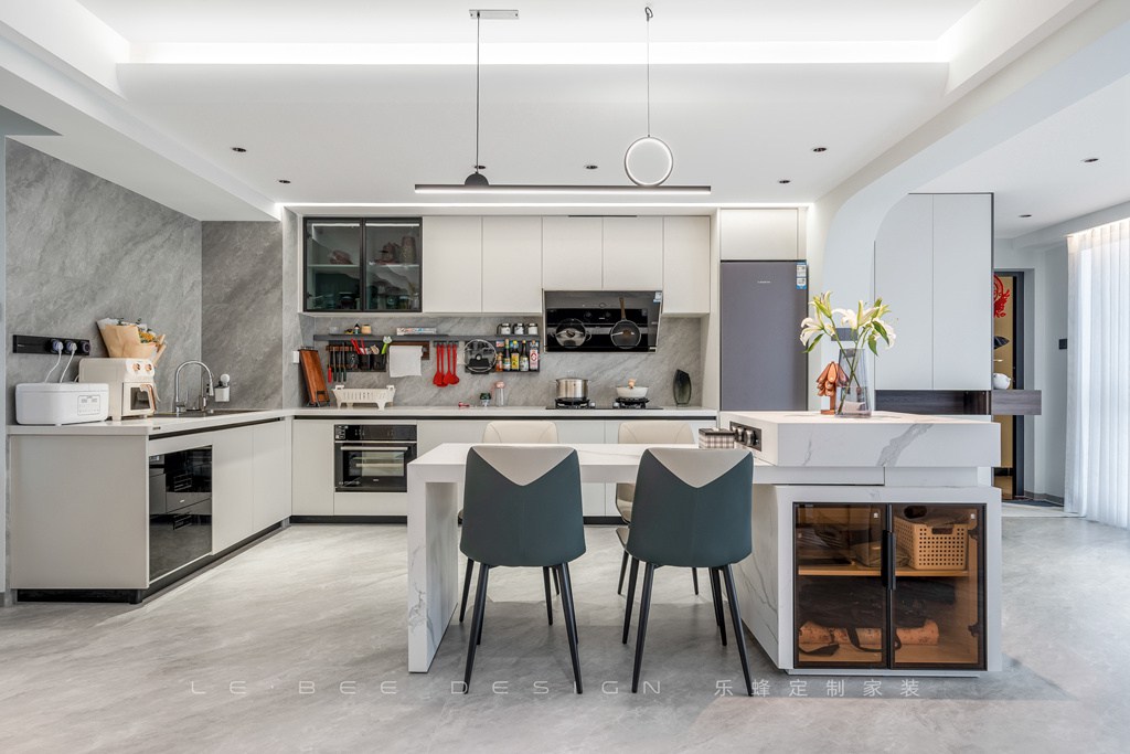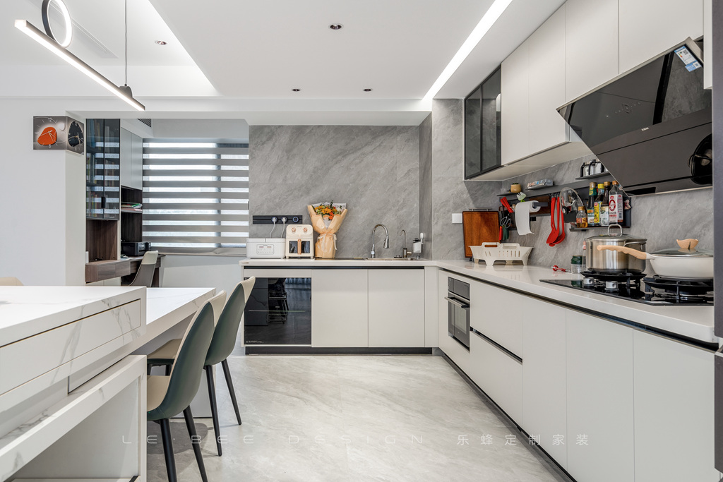 開放式的餐廚以灰、白為主,用灰色的瓷磚貼墻面,清潔方便不易臟。電器嵌入柜子與墻的中間空間,烹飪區設計師設計一條長燈帶將燈光加強烹飪照明更清楚。用寶格麗的巖板設計島臺餐桌一體化,島臺多功能花設計收納柜。輕奢款綠色的餐椅搭配其中,高級簡約。