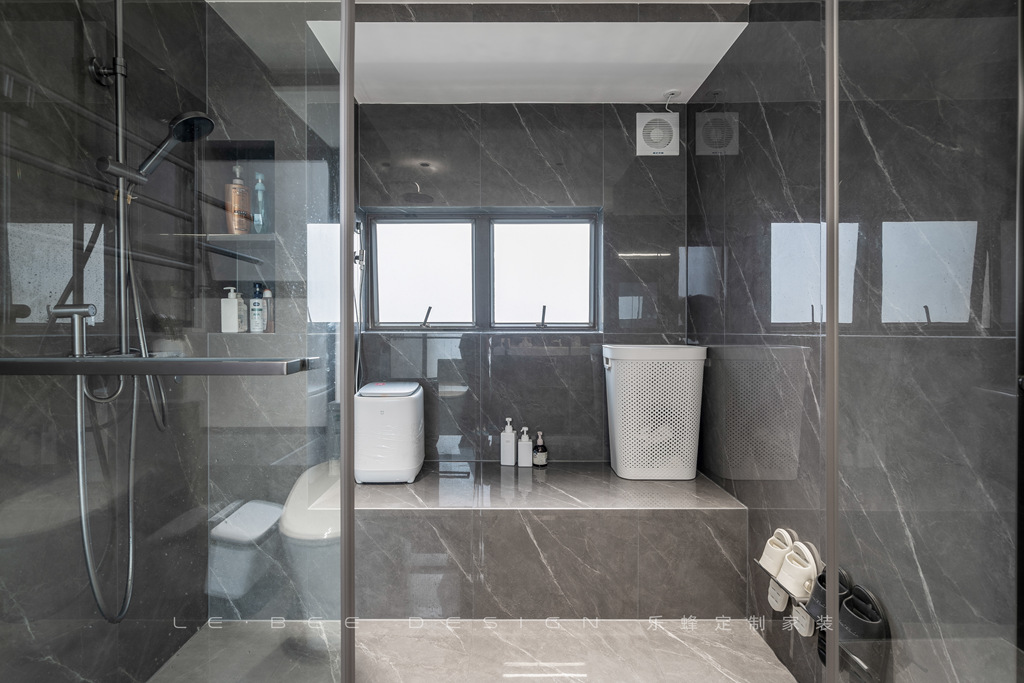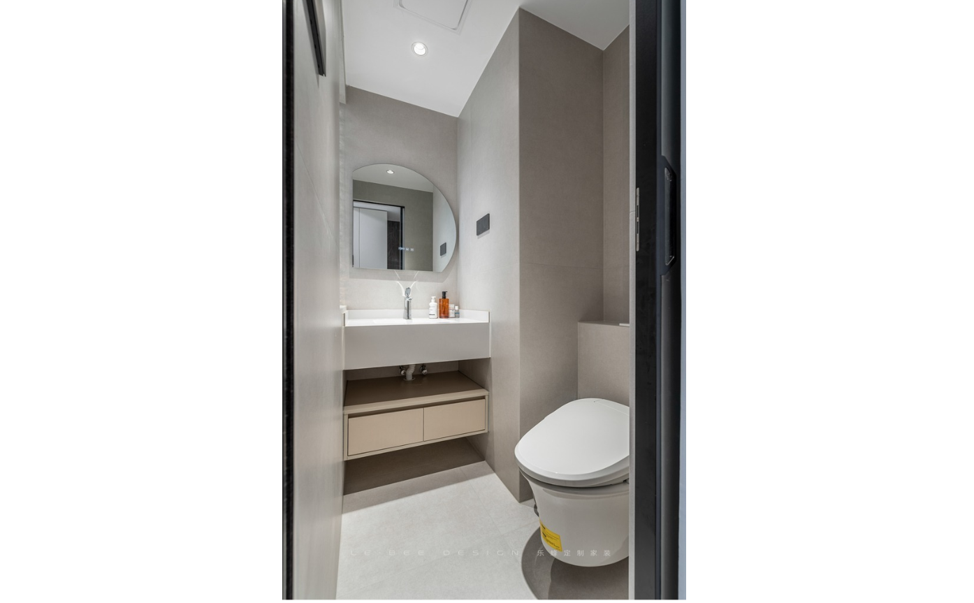 洗手間使用高級灰和玻玻璃推門設計,設計坐臺,可以放置清潔電器和臟衣籃,干濕分離的設計協調大方,鏡面柜設計多一些儲物空間。