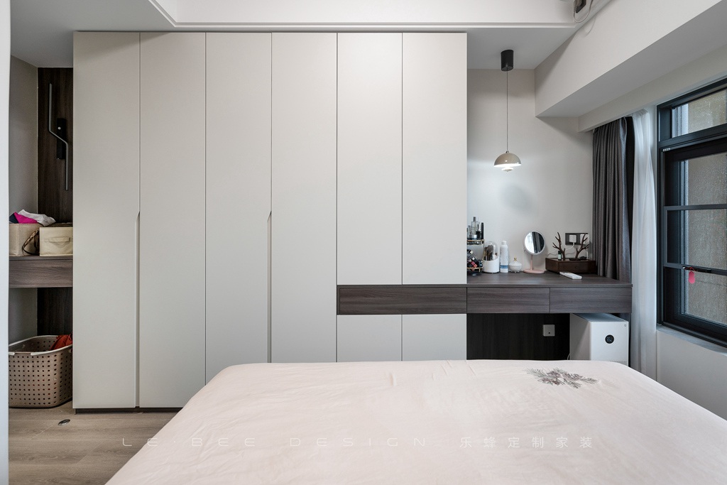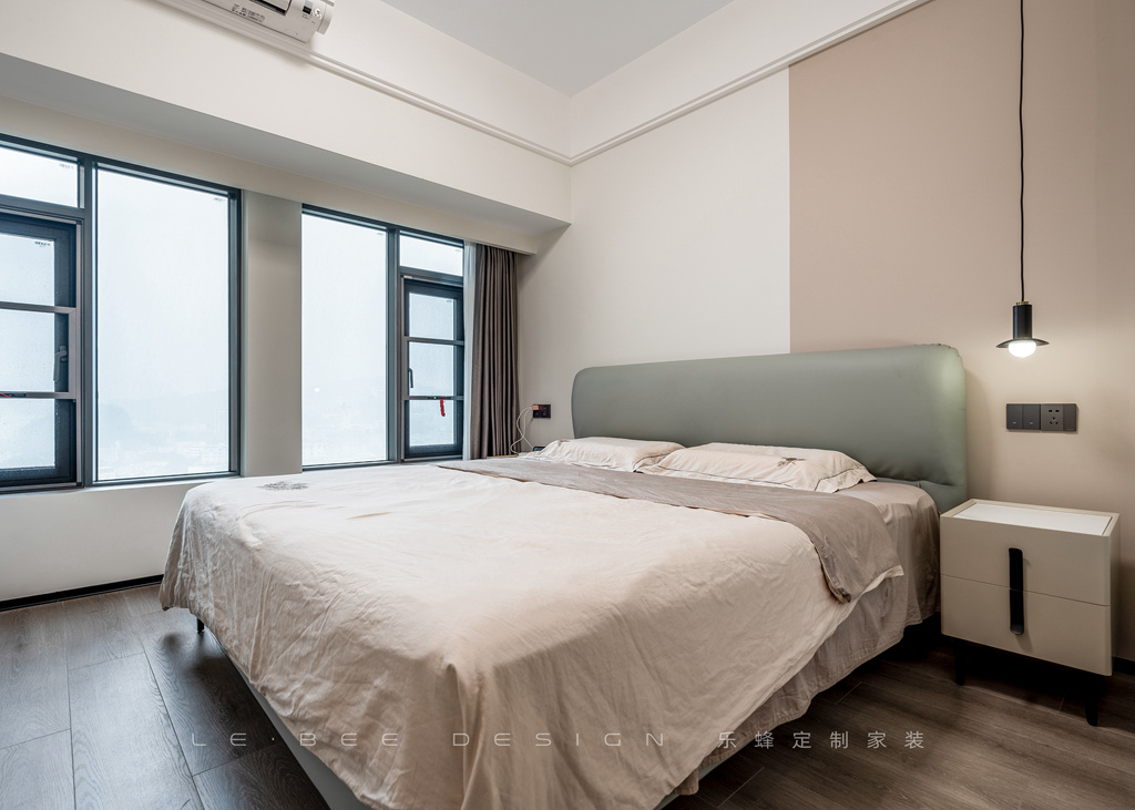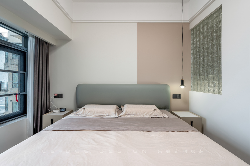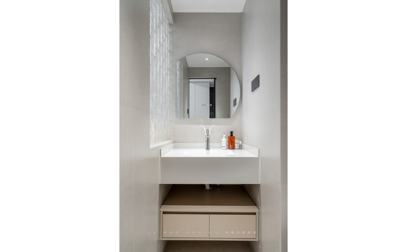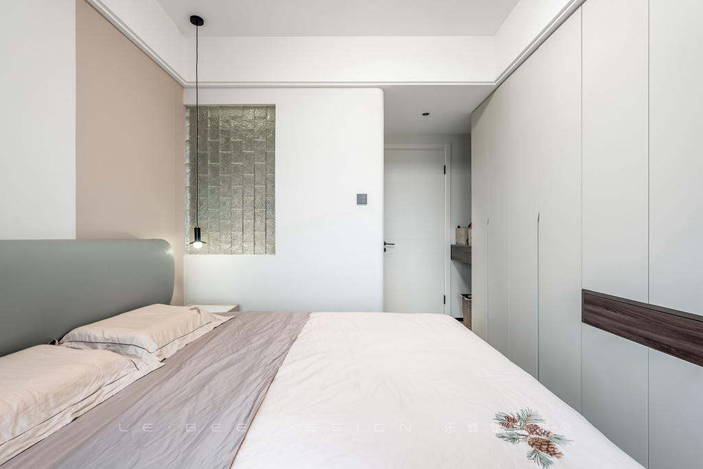 主要色調為白、粉、灰,休息區背景用白、粉相拼,利用玻璃磚裝飾臥室搭配長線吊燈,溫馨清晰的感覺。主衛懸空馬桶、洗漱臺設計,不規則鏡面,跟具不同需求可調燈光。洗漱臺擋水設計墻面保護更到位,插座蓋細節設計很貼心。