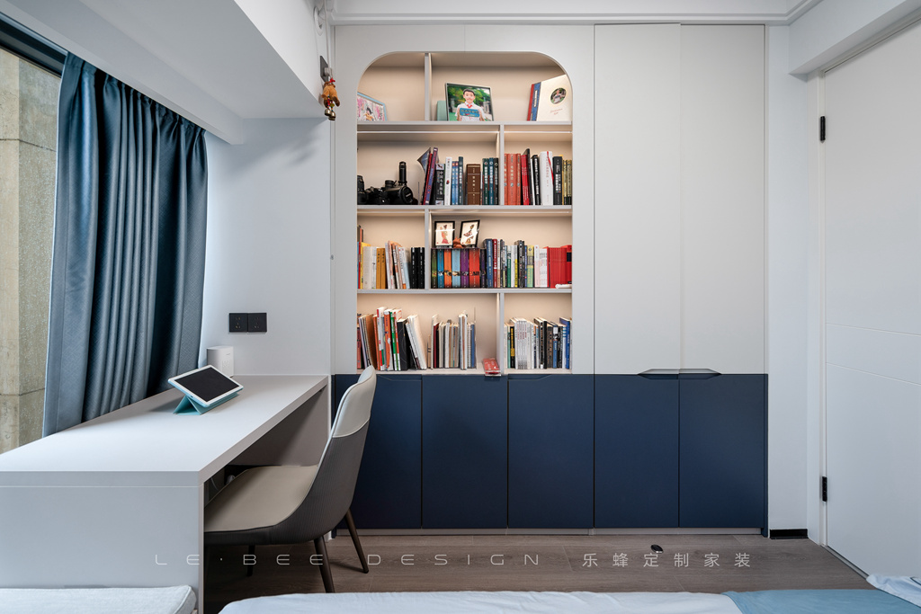 小孩房以藍白為主,同樣運用深淺搭配出視覺層次感,不會視覺疲勞。嵌入式的衣柜書柜一體設計,男孩沒有太多的衣服,坐在床邊的書桌上看看書也不錯。飄窗也設計休閑處收納和休閑空間搭配得當。