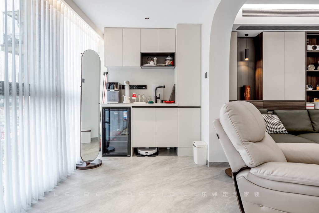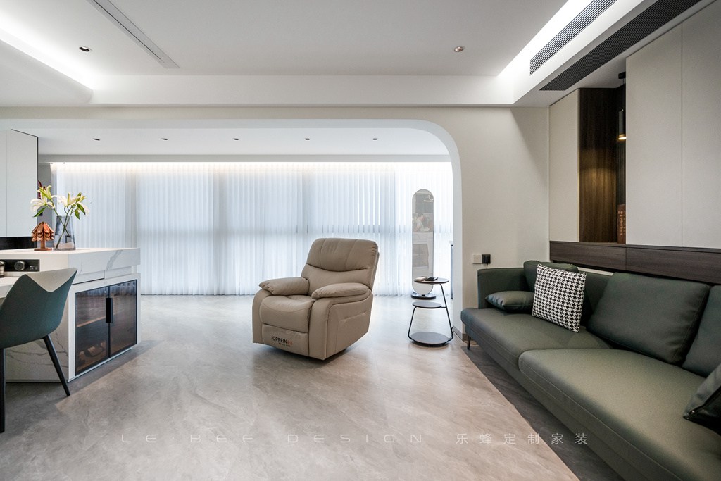 本案業主是一家三口人居住,改變傳統不要電視背景,設計隱藏式的投影儀。沙發靠墻,沙發背景用深色原木搭配格柵既是一道景也是收納空間。陽臺設計弧形埡口提升空間美感,利用陽臺設計功能區,可以照照鏡子,欣賞自己提高自信。
