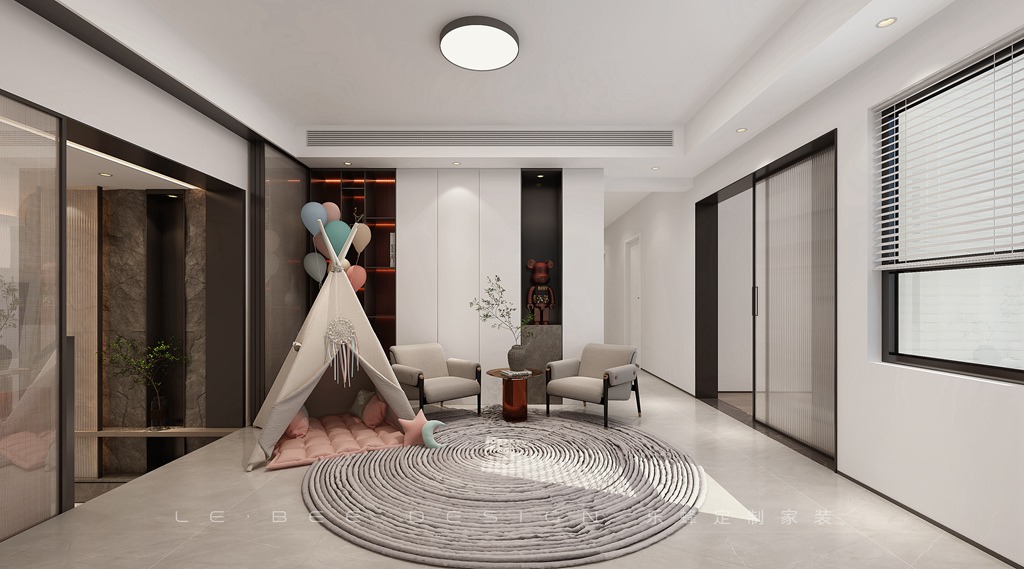 客廳通鋪柔光地磚通鋪至陽臺,橙、灰、白為主色調,設計客廳主燈,電視墻懸空+層次感設計。客廳設計師為小業主們設計了一個娛樂休閑區,設計帳篷增添休閑氛圍感,搭配一個圓的灰色地毯和兩張單人椅,業主夫妻可以與小業主們一起享受休閑的親子時光。