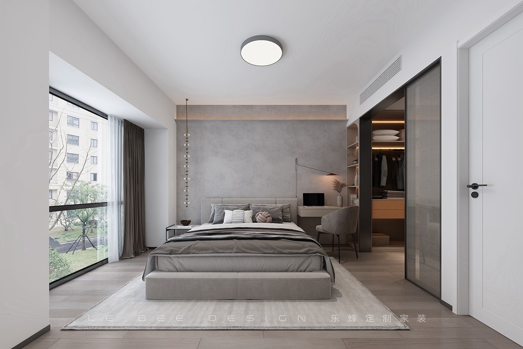 主臥鋪原木地板,深灰色搭配淺灰色、黑色,層次分明。灰色花紋做背景搭配墻燈,床頭桌設計懸空式搭配臺燈,通往衣帽間的隔斷設計收納隔板和玻璃門隔斷,不銹鋼埡口包邊簡約又高級。