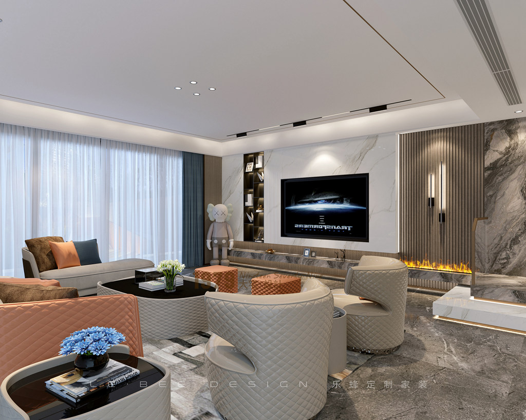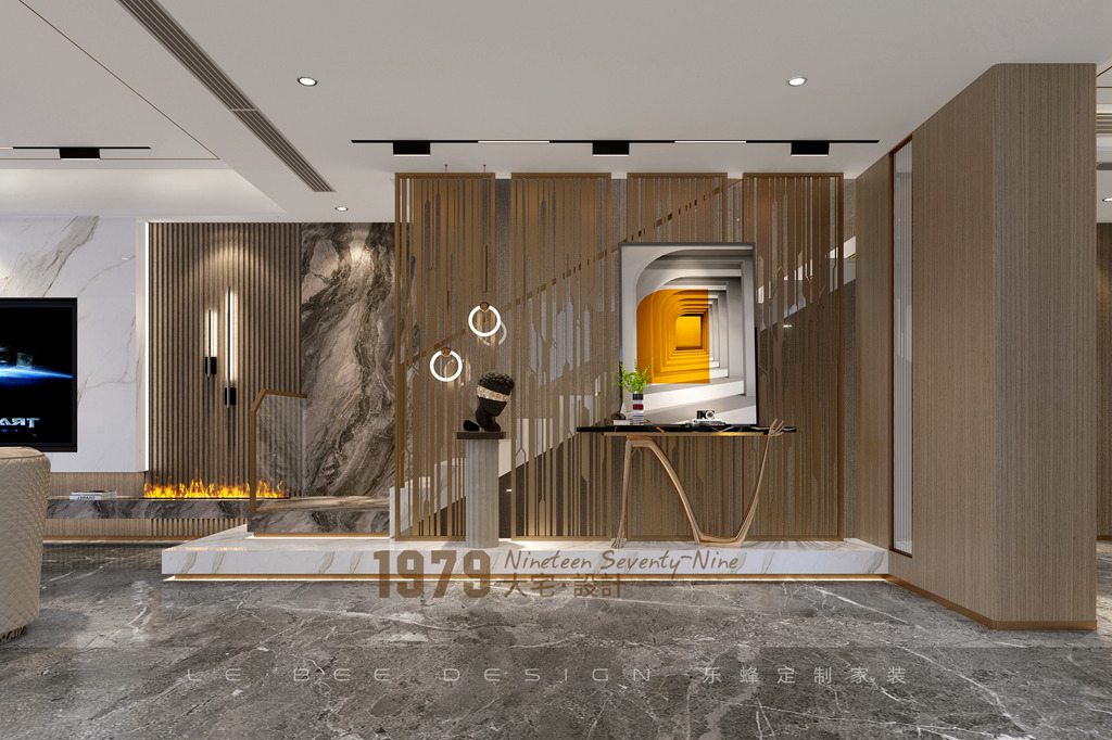 側面設計鞋帽柜滿足業主一家日常更換鞋履的需求,和提升客廳的隱私感。做了懸空造型加地臺更顯高級,格柵、墻燈搭配仿真火焰壁爐為電視墻增添美觀度。