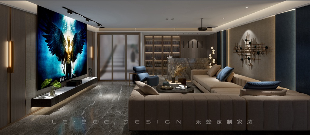 棋牌茶室設計在一起,都搭配不同意境的掛畫裝飾,一邊是優雅清閑的飲茶區,黑色茶桌、橙色椅子、圓木墩搭配長吊燈,另一邊是棋牌區一家人圍坐在一起打打麻將好是悠閑。還設計了一排儲物收納柜存放茶葉很適合。推開玻璃門進入到光影廳,懸浮的吊頂設計將幕布隱藏到吊頂中,投影儀設計觀影效果更佳,一家人可以盡情地享受光影時間。