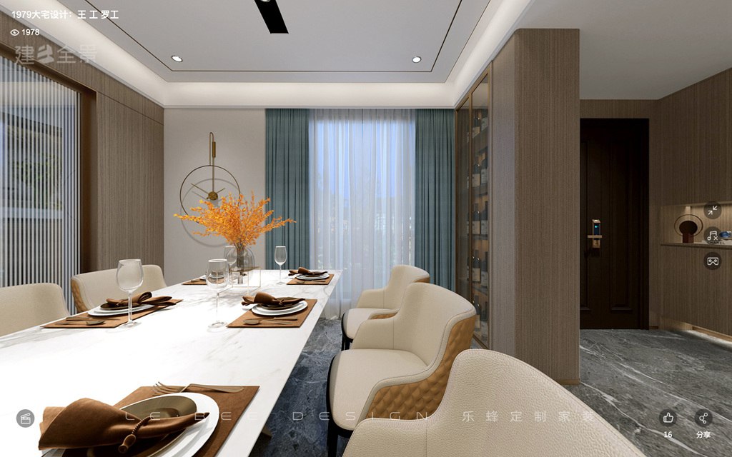 餐廳懸浮頂,射燈設計空間氛圍感超強,使用巖板餐桌搭配橙色皮質餐椅,用藍色的窗簾更豐富。