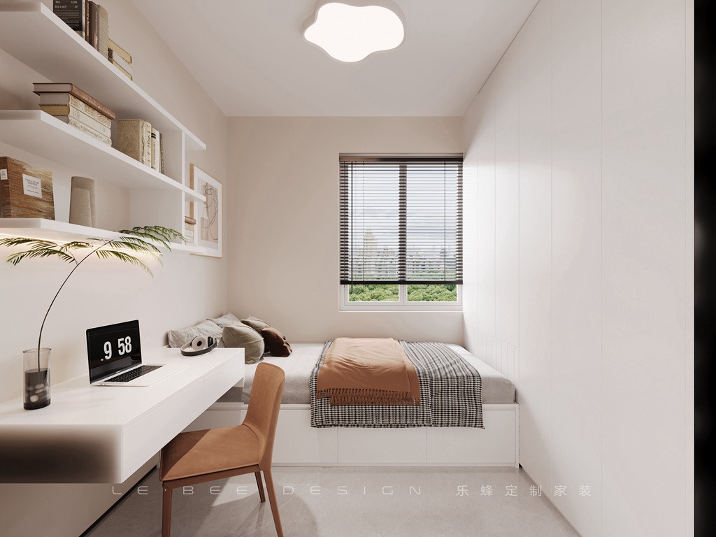 主臥刷上溫暖色調的乳膠漆,床頭背景增加了藝術畫飾,扭轉了單調感,營造出獨特的藝術氛圍,簡約卻不簡單。床頭燈設計讓人感覺溫馨。床尾的隱形拉手設計讓衣柜更加精致,梳妝桌的白色搭配橙色,墻上的隔板設計成開放式書架,一側的百葉窗則給房間增添了另一種氛圍。