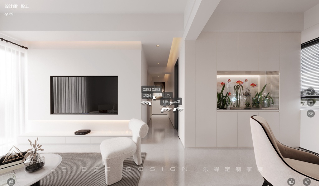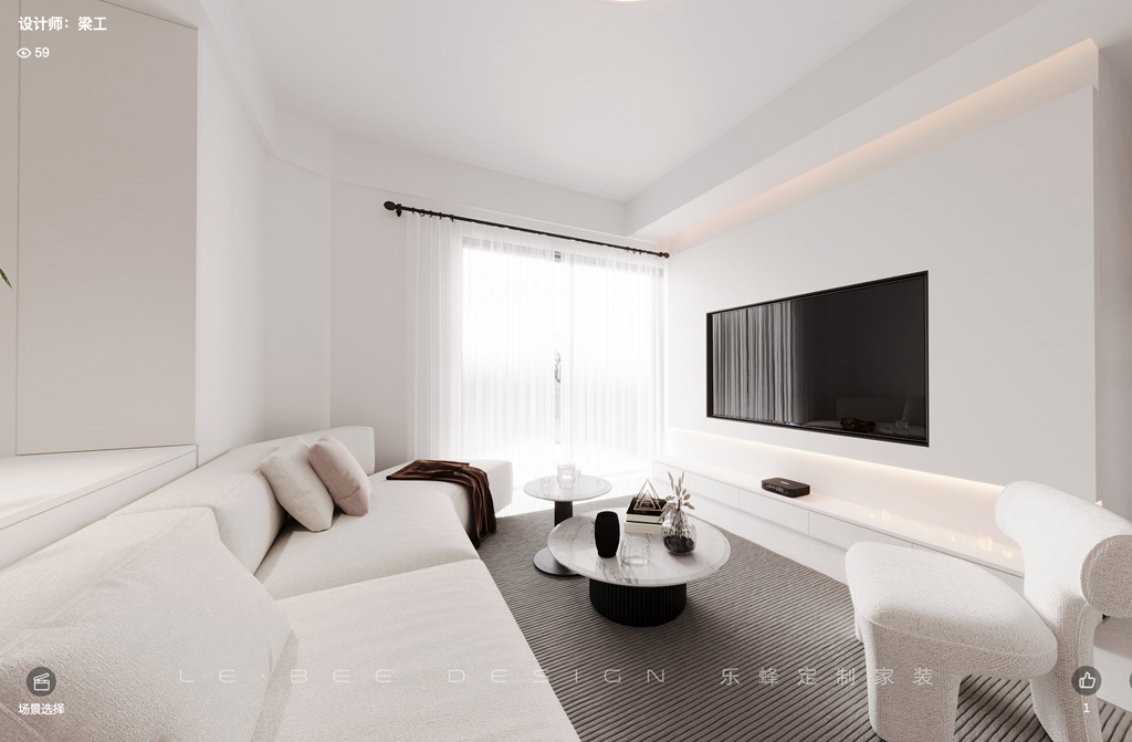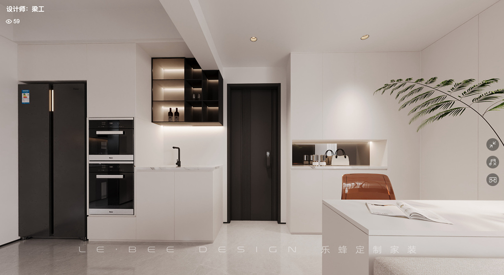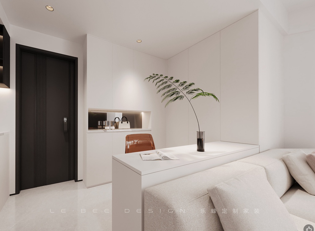 回到家中,在入戶左邊的鞋帽柜溫暖迎接,輕輕放下包包,順便換下疲憊的鞋子,仿佛脫去一天的繁忙。而入戶右邊的電器嵌入柜中,宛如珍貴寶藏,這里可以取出新鮮水果在旁邊的大單槽輕洗,然后坐在舒適的沙發上給自己放個假,享受電視的陪伴,舒緩疲憊,注入新能量。沙發后面精心設計的小吧臺,就像是一個隱秘角落,讓業主在閑暇時可以靜靜地坐在那里沉浸在書海中,盡情汲取知識的香甜滋味。客廳的簡潔白色主導,白沙發、茶幾和椅子如同云朵一般柔軟,懸浮的電視墻讓電視嵌入墻中,懸浮地柜設計更是別具一格,窗簾沒有采用窗簾盒子,而是利用黑色窗簾桿,點綴了屋內氛圍。