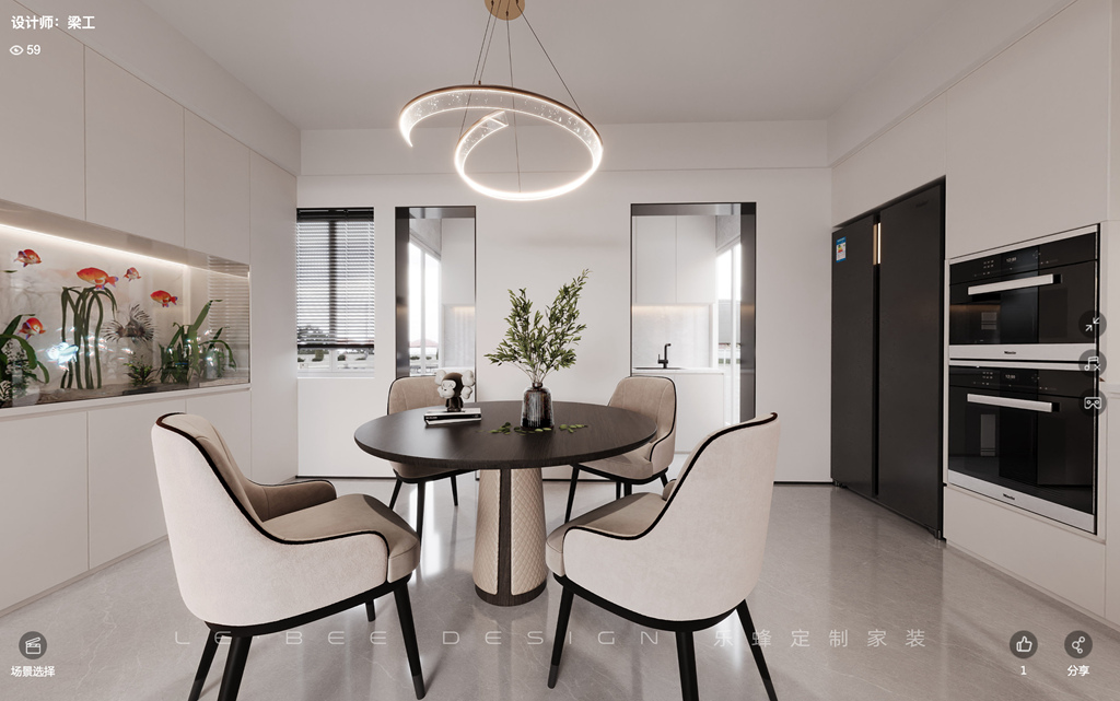 餐廳的設計以黑、灰色調為基調,圓桌設計散發著神秘感,吊燈散發著柔和的光芒,而黑色的花瓶搭配綠色植物則增添一絲生機。餐邊柜的設計破除了現代傳統的陳規,變成了一道優雅的景色,同時還有著實用的收納功能。