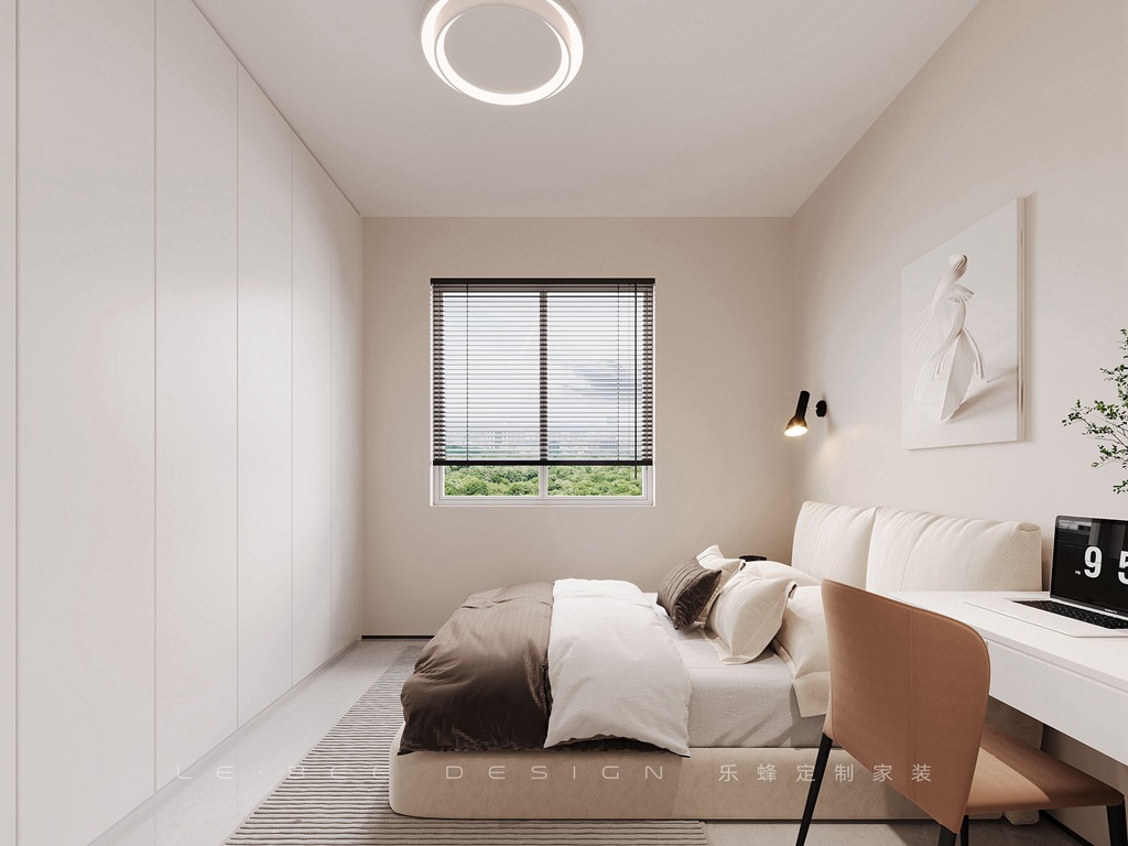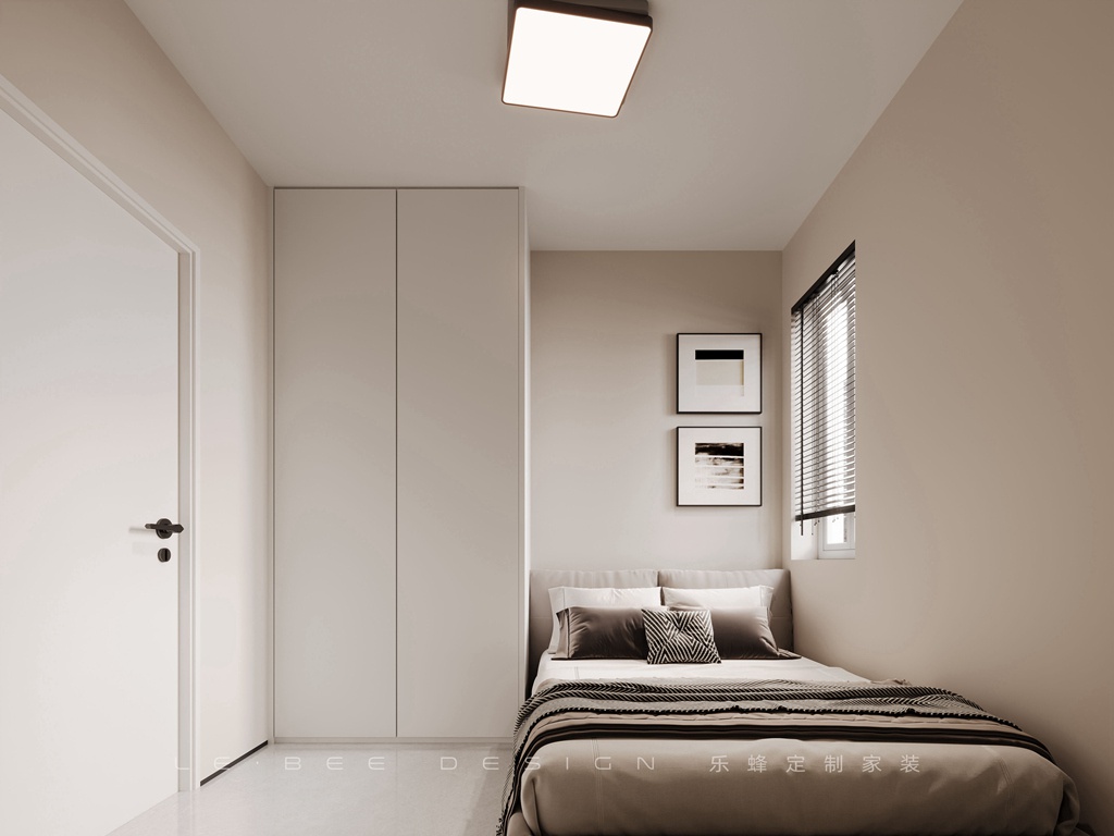 次臥的墻面涂上奶茶色的乳膠漆,休息區用素色來打造,背景墻掛上兩幅簡潔而精美的掛畫。
