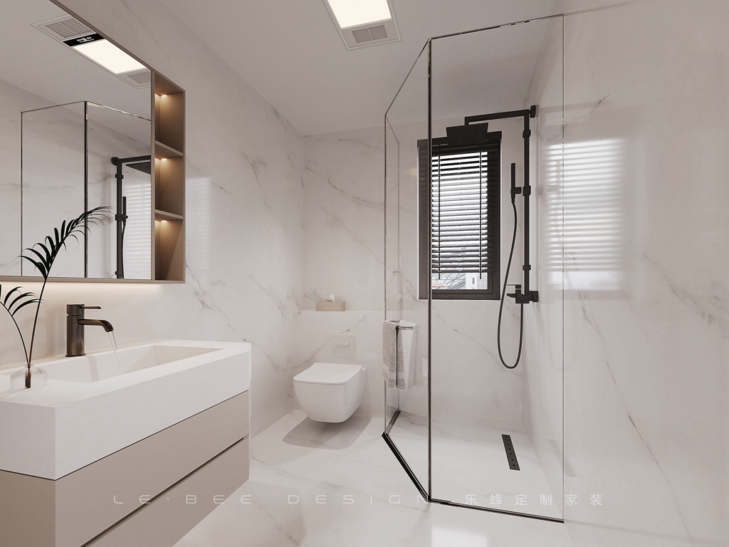公衛采用干濕分離的設計,鏡面柜散發著奢華感,懸浮的巖板洗漱臺宛如一塊藝術品。隱藏式馬桶水箱設計更顯簡潔美觀,而黑色大浴霸和長條形地漏則彰顯出高級與簡約的結合。