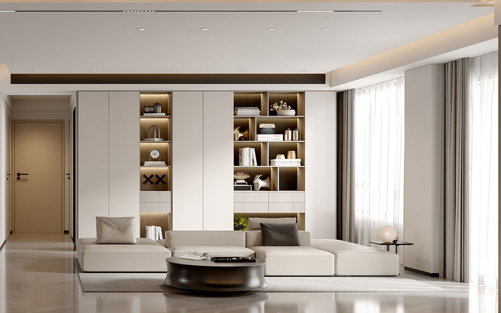 沙發(fā)區(qū)域的背景墻采用淺色調(diào)的收納柜,簡潔的線條和干凈的造型,設(shè)計開放格的同時,在墻面上巧妙嵌入的燈帶不僅為夜晚提供溫馨的照明效果,同時也作為裝飾點綴整個墻面,使得簡約之中不失精致感。