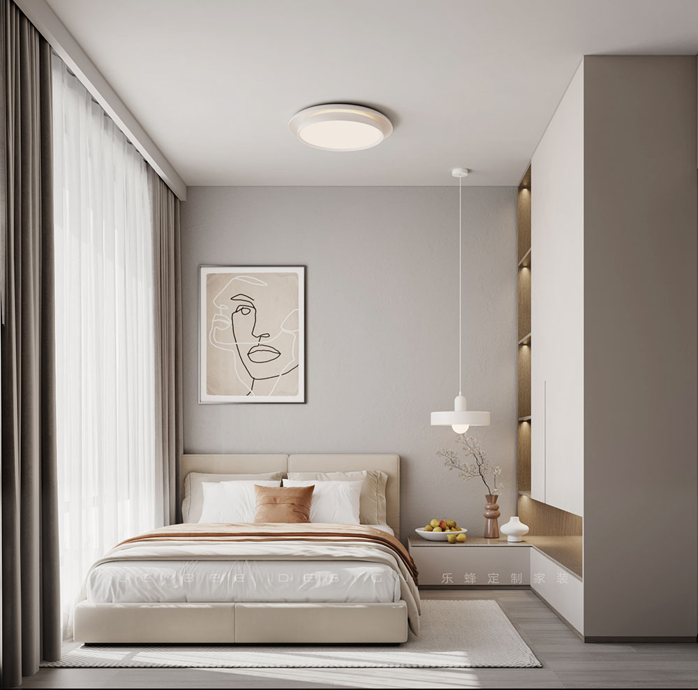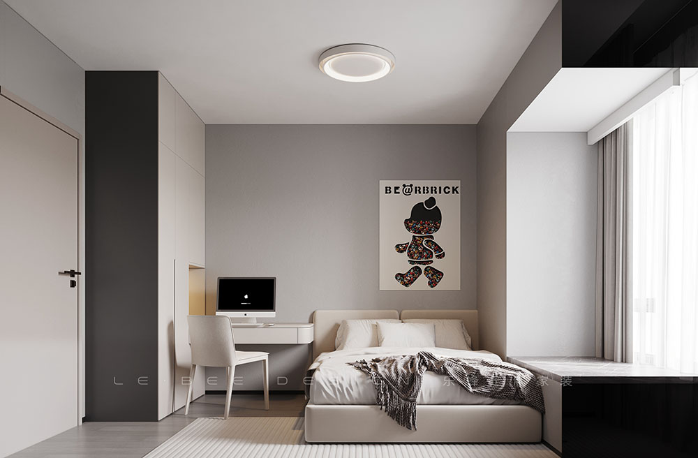 臥室設(shè)計考慮了存儲、美觀與功能性,木格柵和木飾面設(shè)計增添了收納空間,內(nèi)嵌燈帶優(yōu)化了光線。開放格和隱藏?zé)艄庹宫F(xiàn)了奢華細節(jié),簡易的花瓶裝飾更增添了一抹生活情趣。辦公區(qū)則布局在右方,一張簡易的辦公桌讓居住者在此辦公或休閑,充分利用空間。床采用米白色成品床墊,輕松營造出舒適的睡眠環(huán)境。