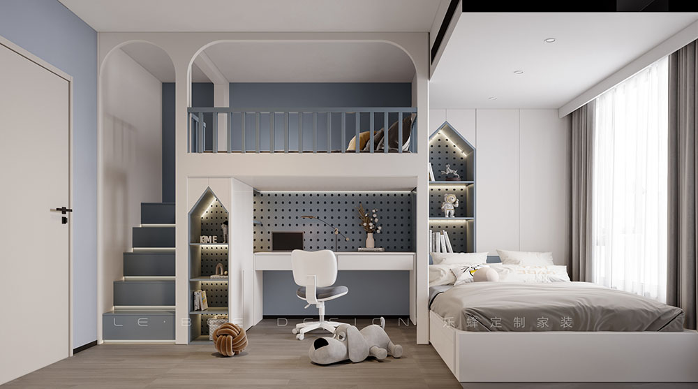 男孩房的設(shè)計藍色基調(diào)結(jié)合流行的太空元素,加上黃色的點綴,無疑激發(fā)了孩子們對探索宇宙的好奇心和熱情。吊椅的設(shè)計既有趣,又能提供一個安靜的閱讀角落,這是一處非常好的設(shè)計點。暖色調(diào)的設(shè)計配合衣柜和書桌的布局,改變了傳統(tǒng)兒童房的印象,為孩子提供了一個舒適且富有個性的空間。這樣的布局不僅滿足了孩子的日常需求,同時也能激發(fā)他們的觀察能力和創(chuàng)造力。另外,讓單人床獨立而不是傳統(tǒng)的上下鋪設(shè)計,也是體貼孩子的一種方式,讓他們有更自由的活動空間和更個人的隱私區(qū)域。