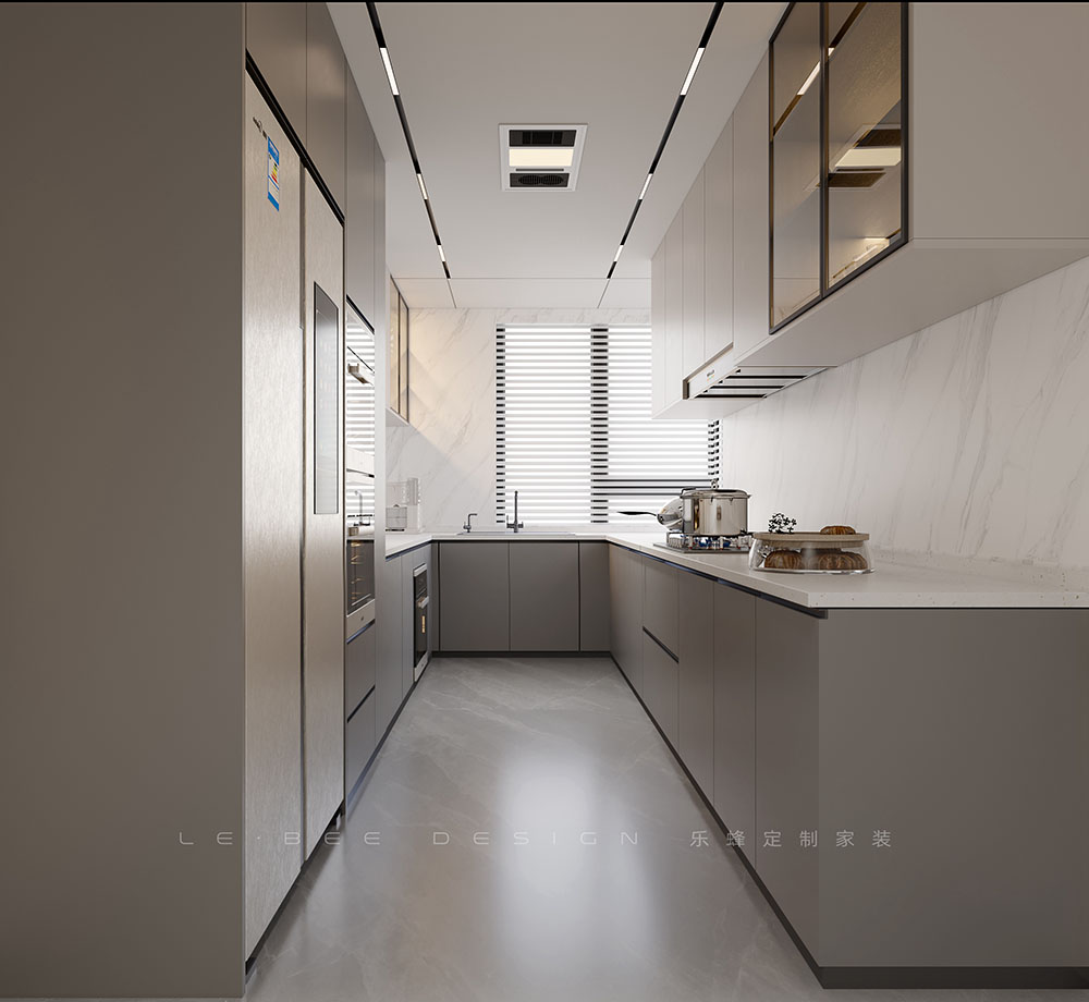 U型廚房設(shè)計,灰色地柜與米白色吊柜搭配,營造出雅致舒適氛圍。明確劃分功能區(qū)域,包括電器、儲物、洗菜、備菜和烹飪區(qū),工作流程更流暢高效。無拉手設(shè)計的吊柜簡潔獨特,便于使用,整潔美觀。大氣的巖板臺面耐用易打理,節(jié)省維護時間。充分利用內(nèi)部空間,儲存、操作、流動更便捷。
