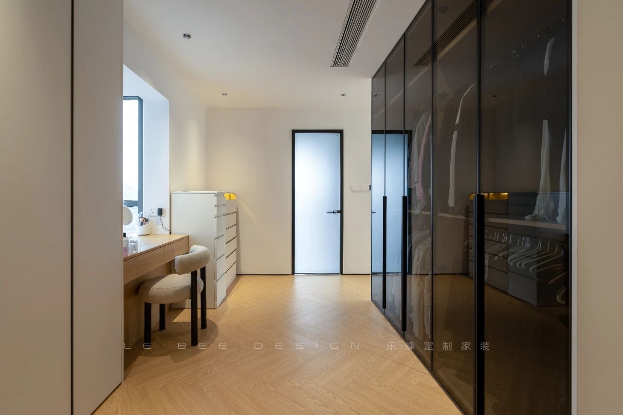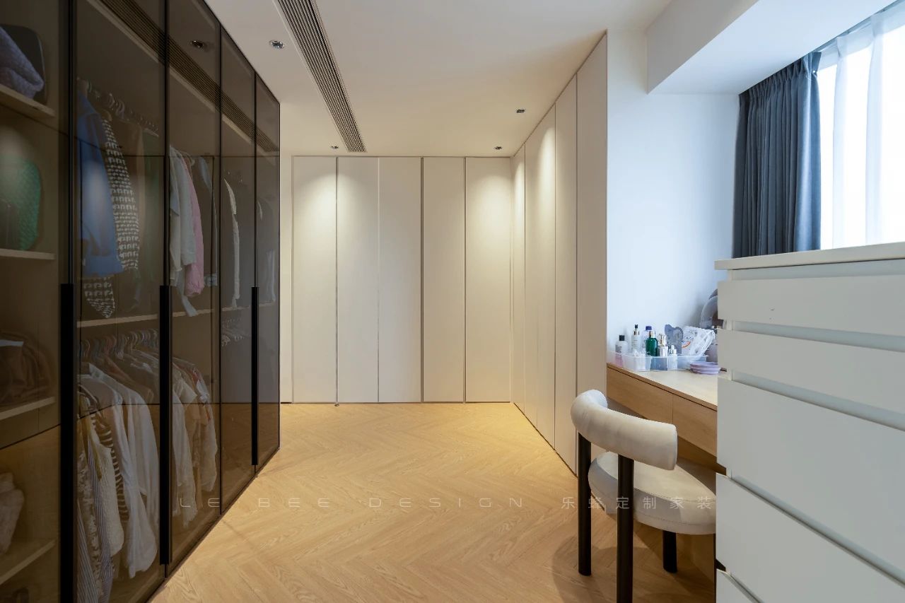 衣帽間布置了整排衣柜,米白色的柜門簡潔大方。一旁擺放了梳妝臺和化妝柜,為生活帶來便利。背后的整排展示柜采用長虹玻璃柜門設(shè)計,增添了空間的現(xiàn)代感和開放感,讓整個區(qū)域更加通透明亮,同時展示了家中精美的收藏品。