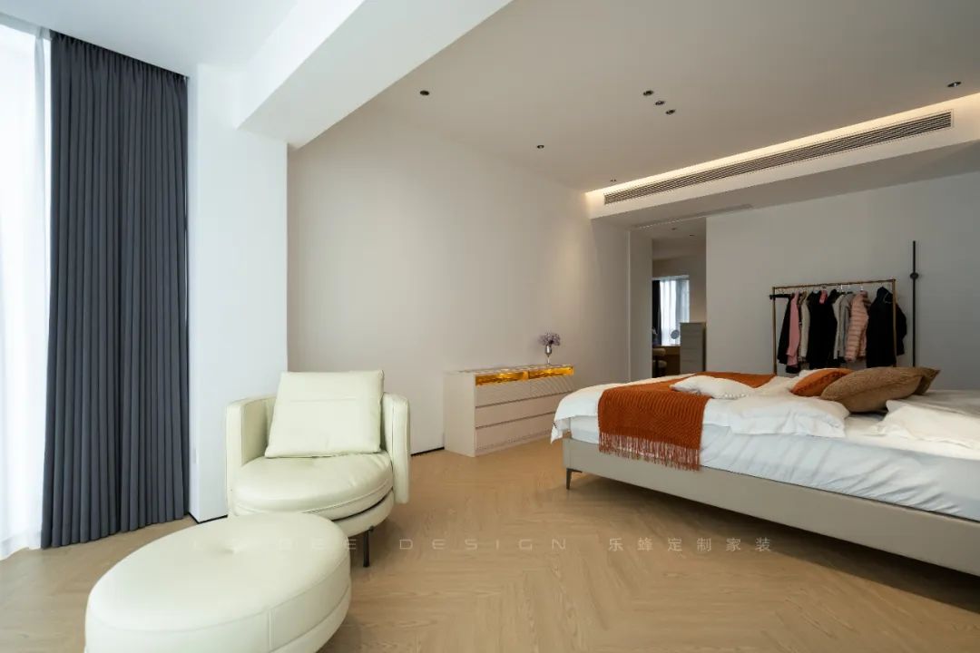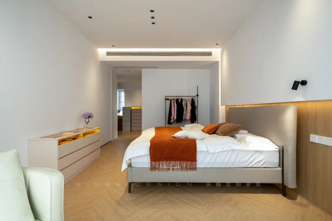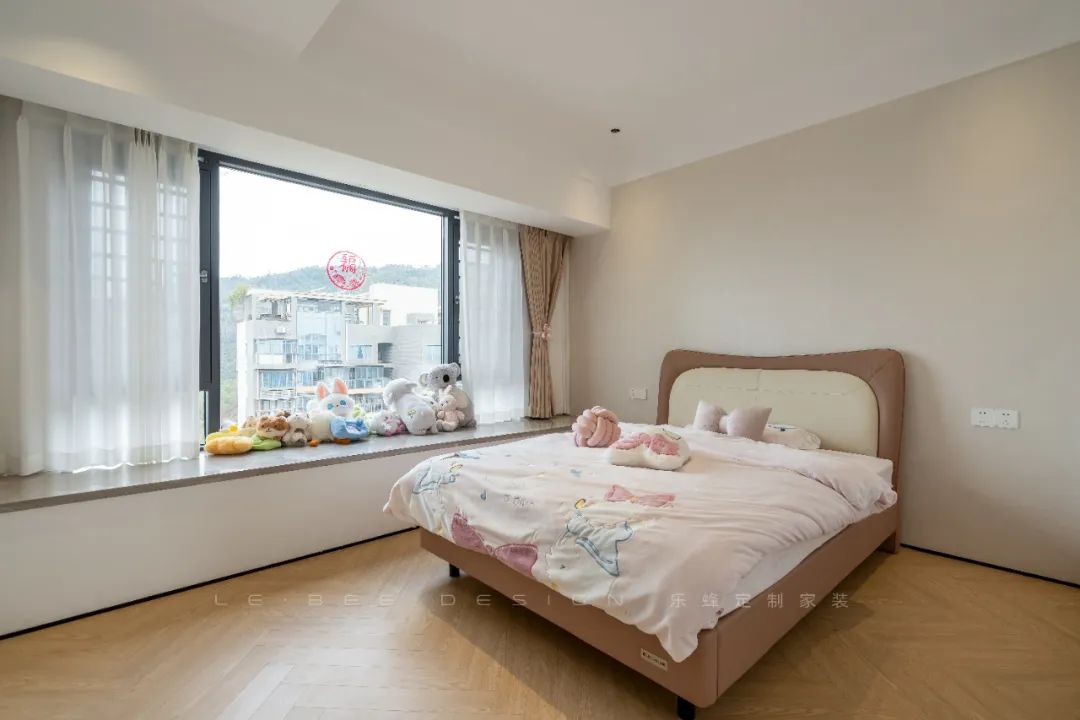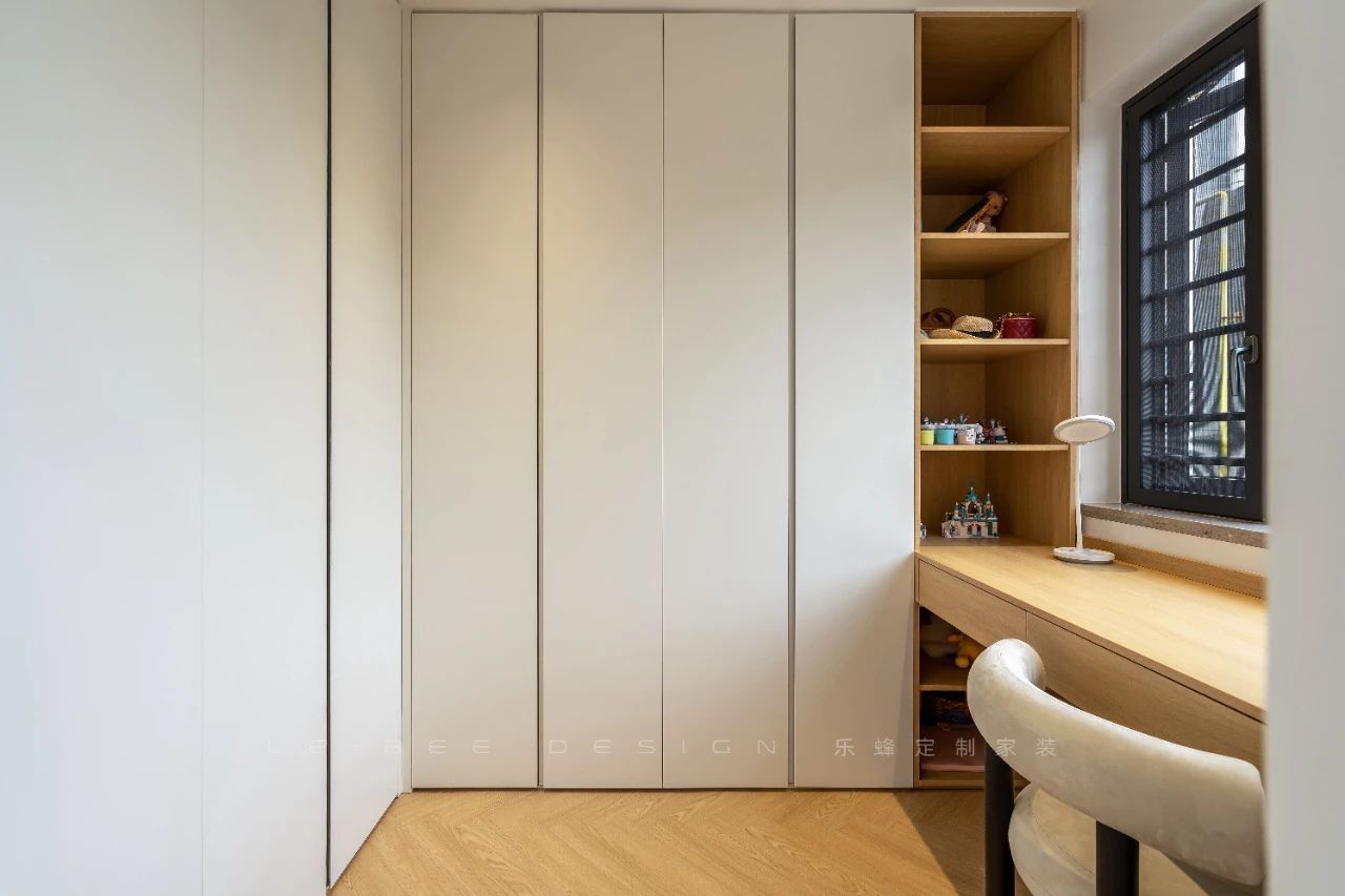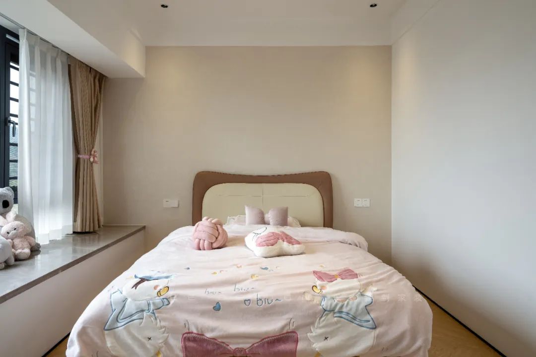 女兒房沒有過多復(fù)雜設(shè)計,整體采用了米色乳膠漆,搭配成品床墊,注重了舒適和簡約風(fēng)格。房間中放置了可愛的裝飾元素,為空間增添了溫馨氛圍。最有趣的設(shè)計是靠窗的位置,特意設(shè)計了一個小衣帽間,兼顧了儲物和衣物擺放的需求,同時也充分利用了空間。此外,衣帽間頂部延伸設(shè)計成懸浮書桌,既實現(xiàn)了辦公學(xué)習(xí)的功能,又增添了房間的靈活性和實用性。