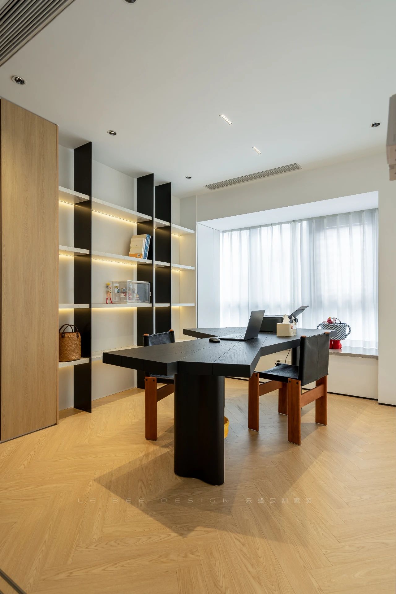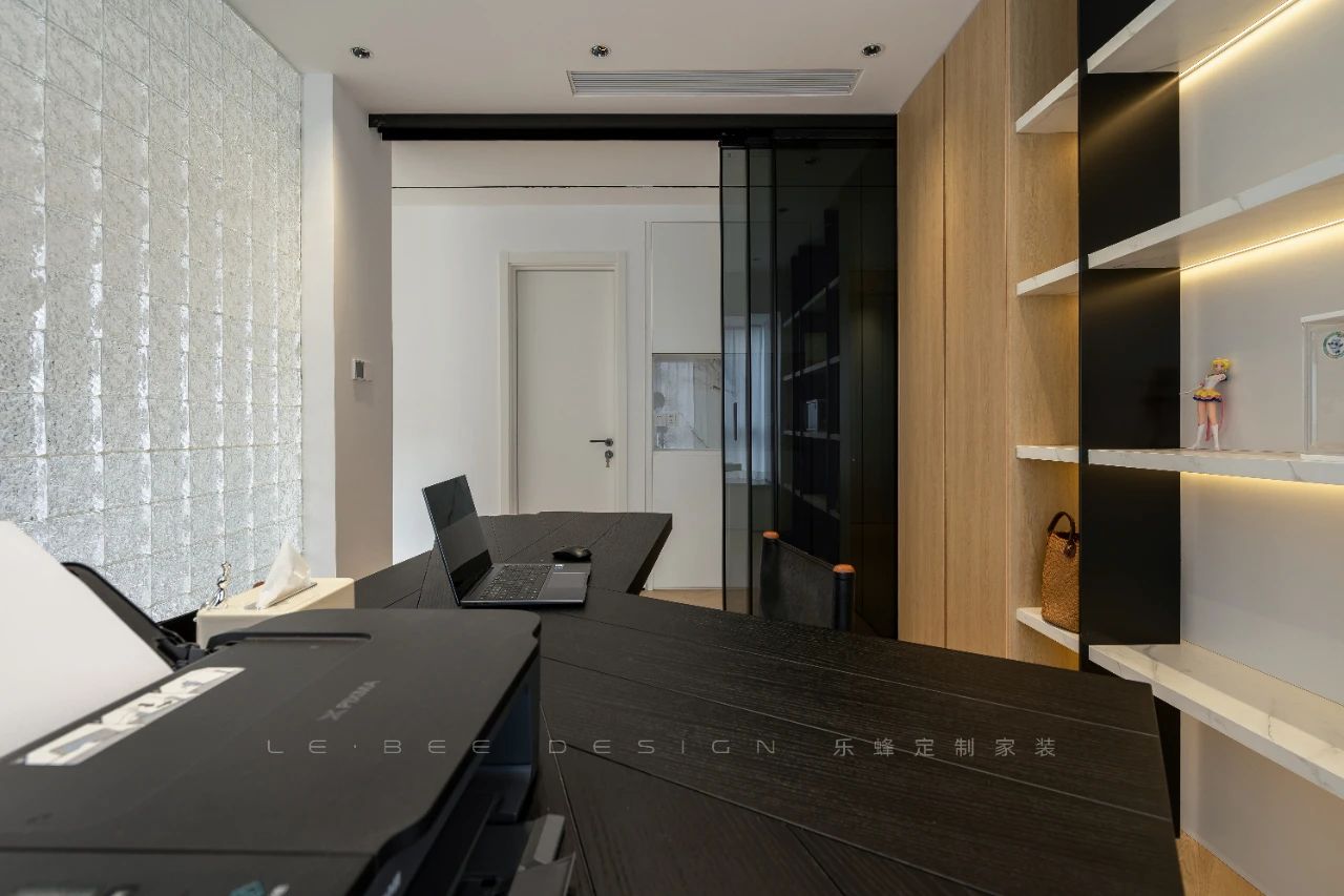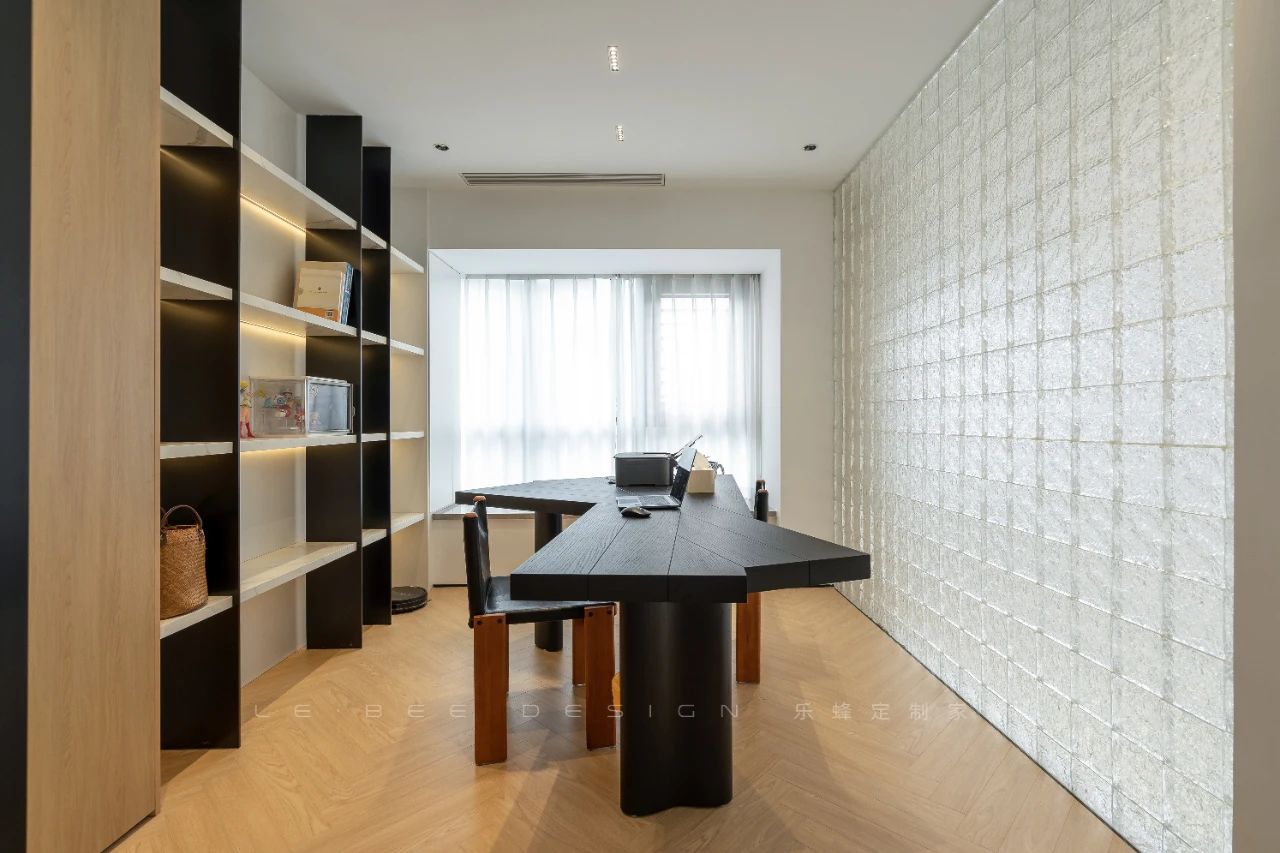 二樓書房的設(shè)計別出心裁,以背景墻打造展示柜,黑白拼接的設(shè)計賦予整個空間獨特格調(diào)。內(nèi)嵌燈帶更添設(shè)計感,為展示區(qū)營造溫馨光影。黑色藝術(shù)烤漆茶桌與玻璃磚墻設(shè)計巧妙融合,陽光透過玻璃磚灑進茶室,溫暖的光線為空間增添了柔美的氛圍,烘托出茶室的溫馨與藝術(shù)氛圍,細膩的設(shè)計感仿佛將空間打造成一幅恬靜的畫卷,令人心馳神往。