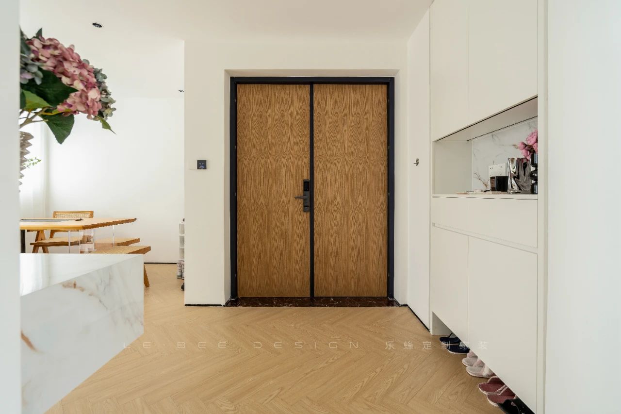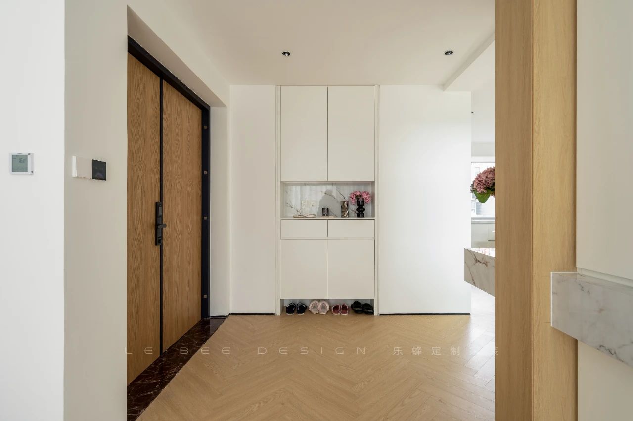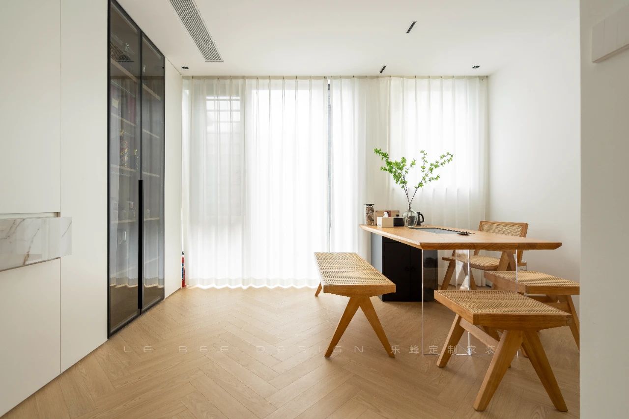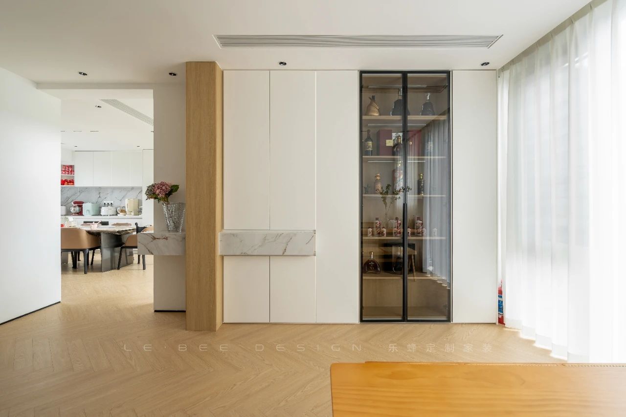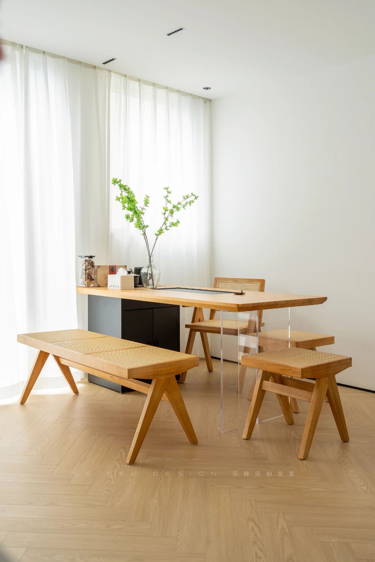 入戶玄關(guān)簡約而溫馨,景端設(shè)計讓人一見之下便被綠植所吸引,仿佛清新的大自然近在眼前。原木與大理石的完美搭配營造出獨特的藝術(shù)氛圍,同時也增強了私密性。懸空設(shè)計的鞋帽柜不僅方便清潔,還能方便更換鞋履。原木的隔斷延伸至兩旁的大理石懸浮臺面,衍生出米白色的收納酒柜。長虹玻璃門設(shè)計既實現(xiàn)了收納酒品的功能,又使整個空間更加豐富多彩,避免了單調(diào)。創(chuàng)造一個深邃靜謐的茶室空間,將自然之美與人文情懷巧妙融合,呈現(xiàn)出一場內(nèi)心深處的靜心之旅。以白色調(diào)為底色,仿若潔白的畫布,原木色則勾勒出歲月的痕跡,展現(xiàn)出大自然的生命力與歲月的沉淀。木制茶臺的線條簡潔流暢,原木紋理的展示如詩如畫,營造出恰到好處的雅致氛圍。燈光的設(shè)計如同一場視覺的舞蹈,與自然光線交相輝映,打造出恰到好處的溫馨與舒適。茶室不僅是品茶的場所,更是心靈的驛站。我們希望通過設(shè)計,營造出一個遠離喧囂的靜謐之境,讓人們在這里找到內(nèi)心的平靜與安寧,感受到生活中最純粹的美好。