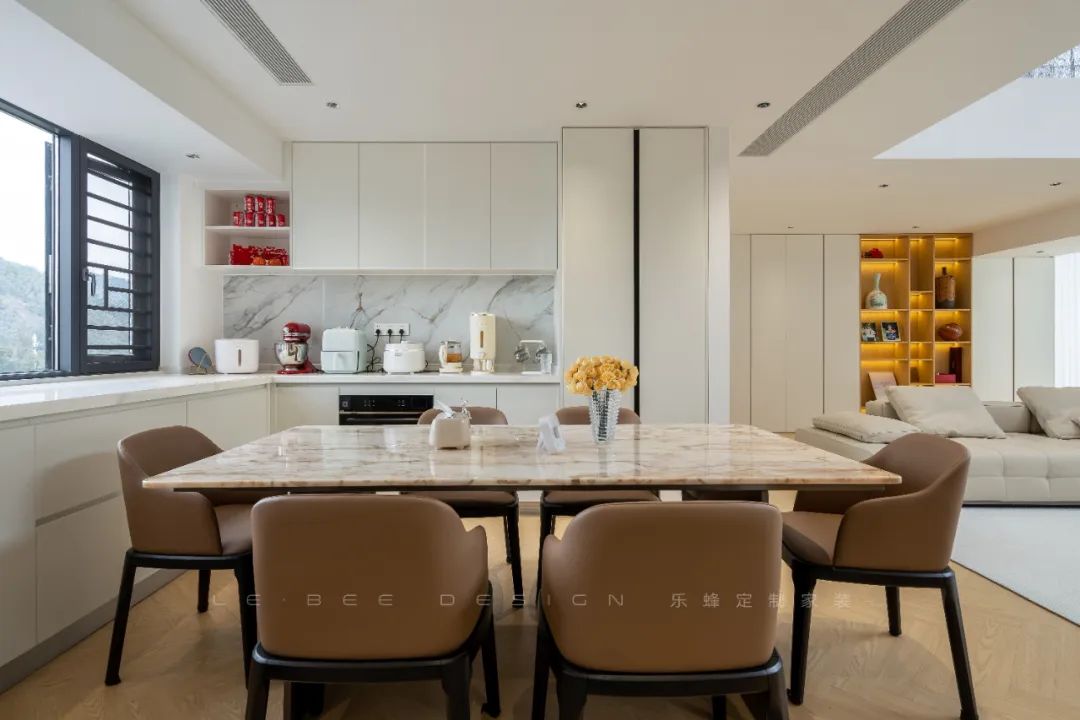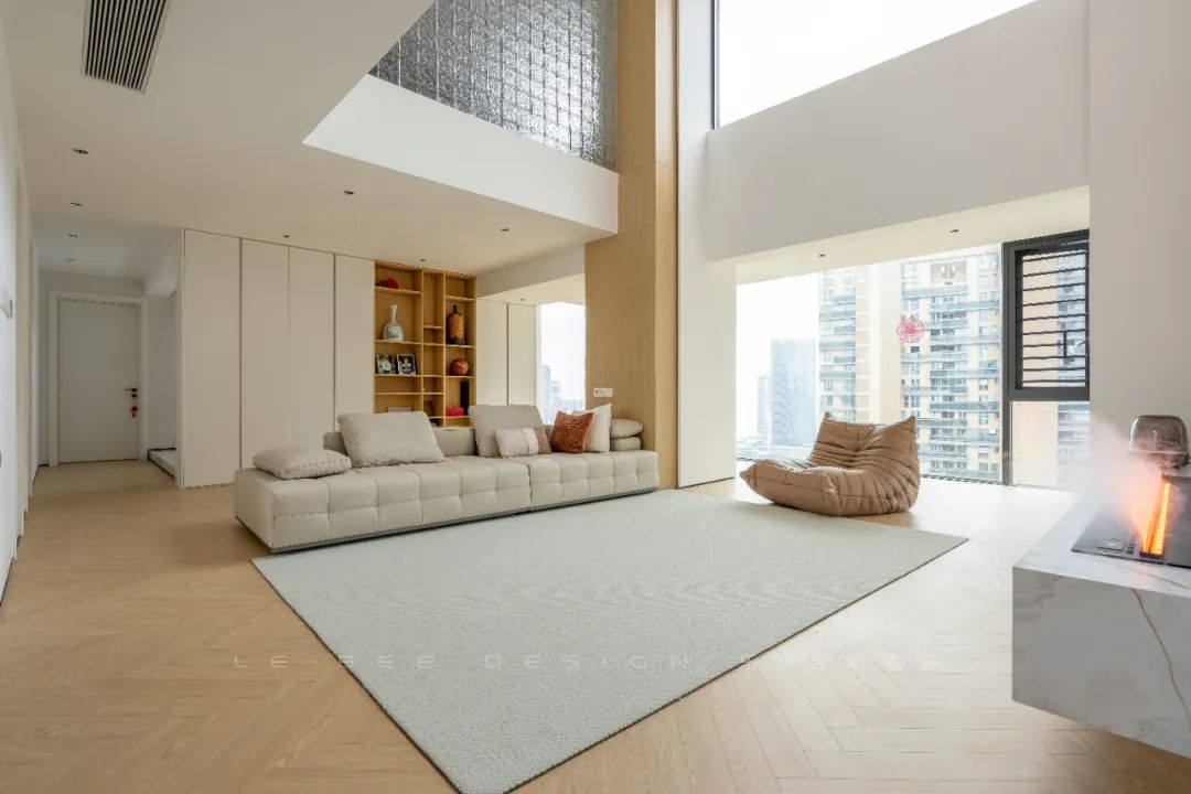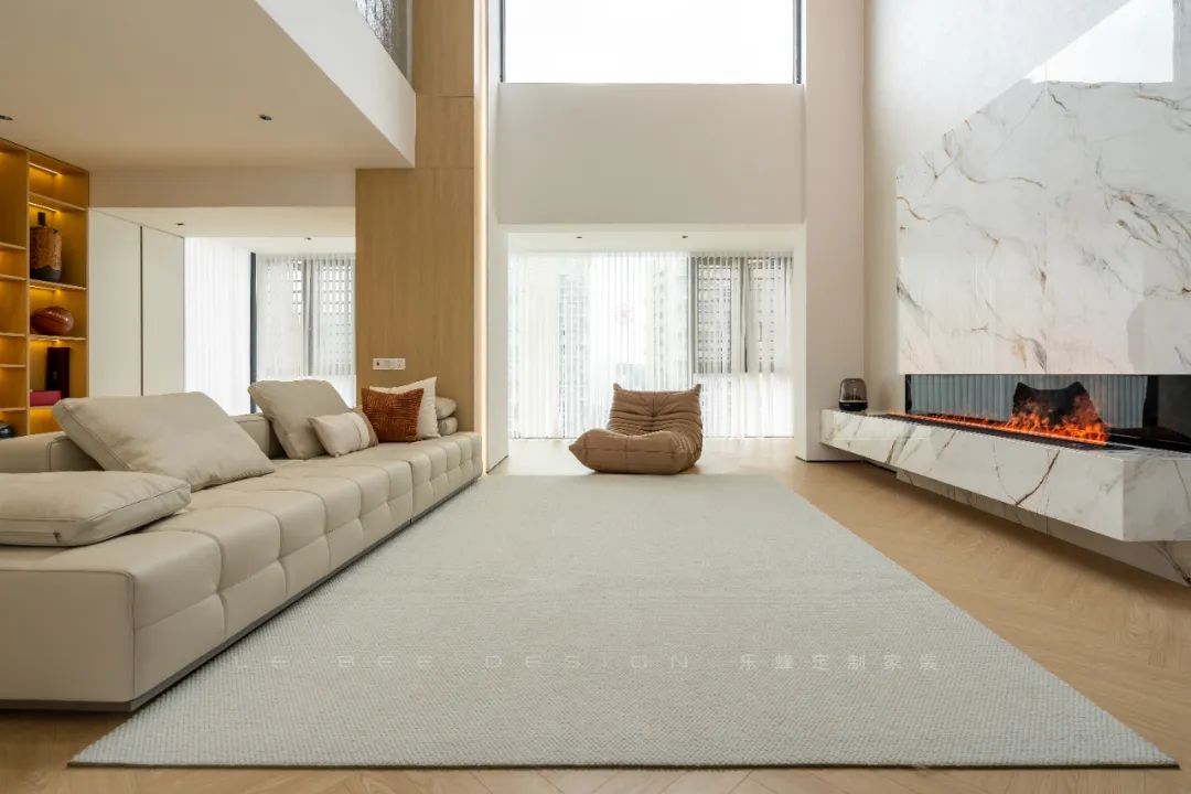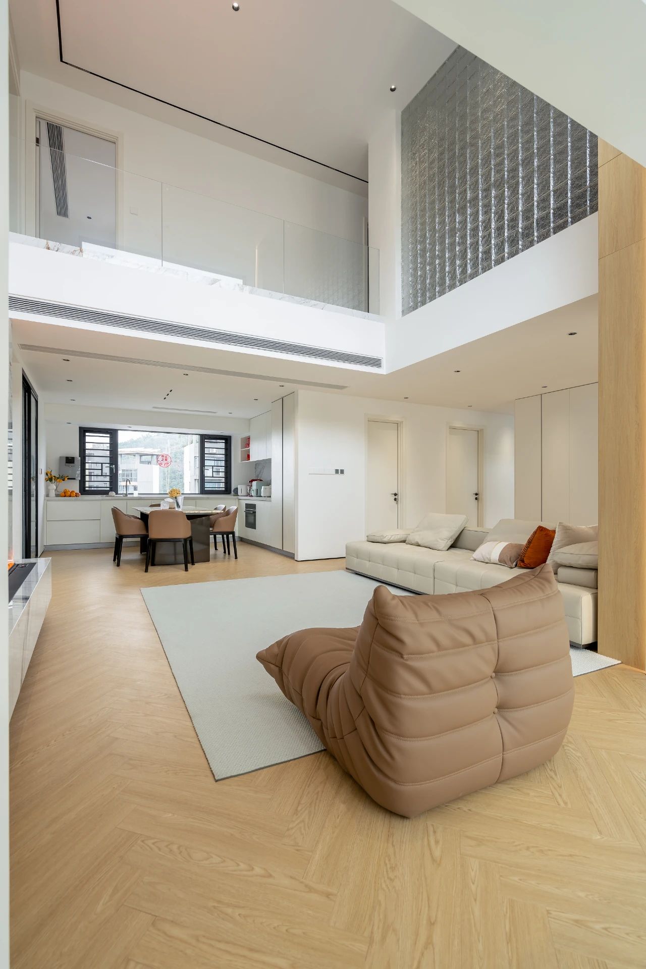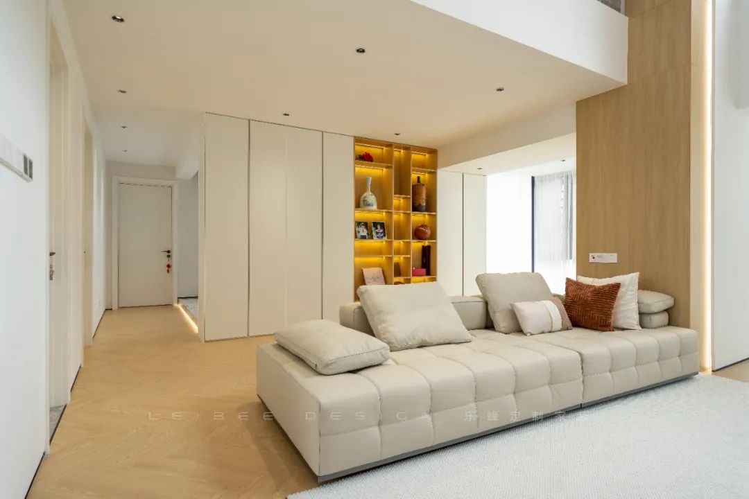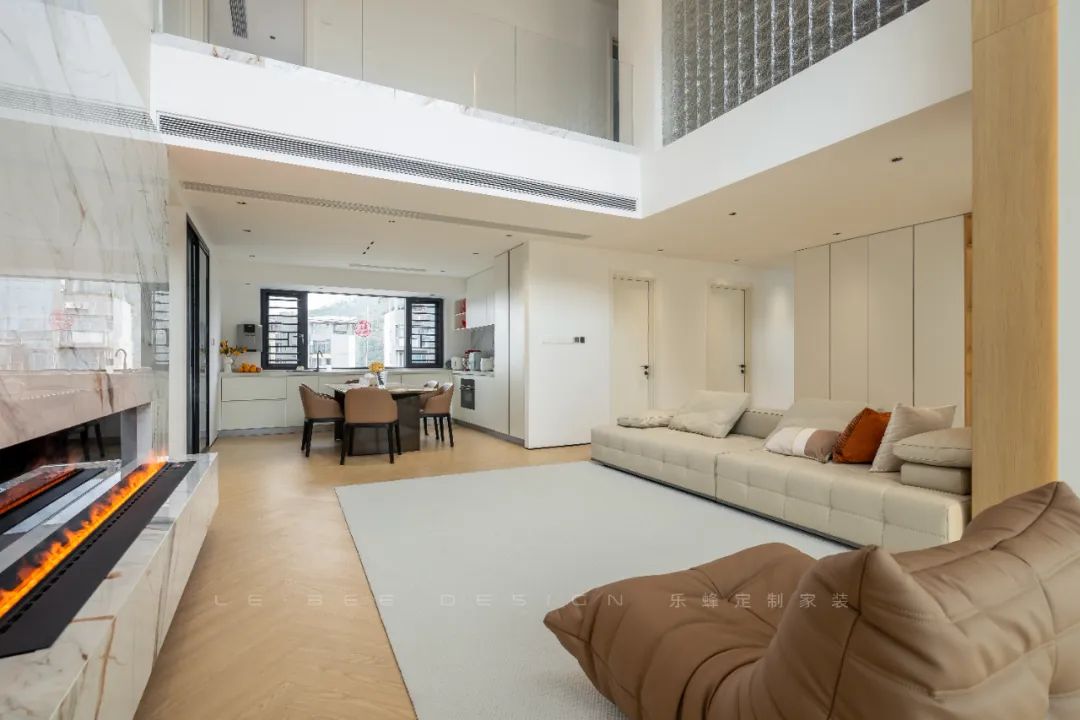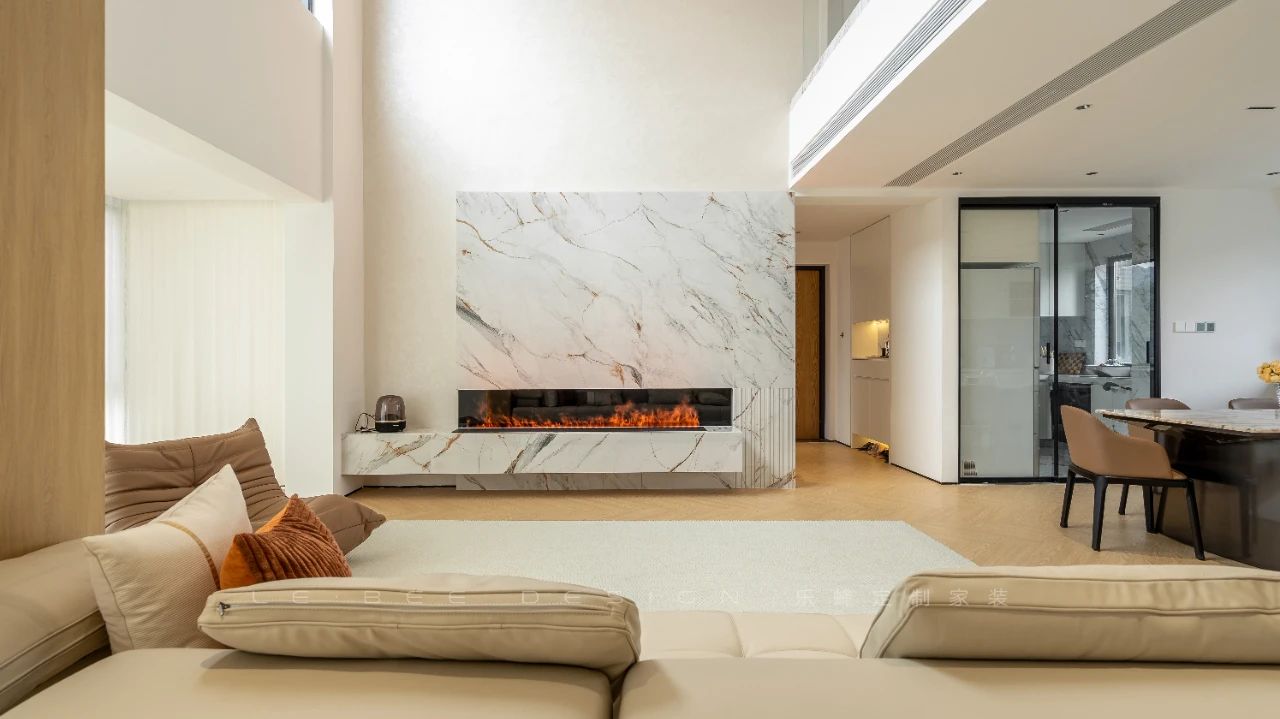 客廳的鏤空設(shè)計與巨大的窗戶相得益彰,使整個空間通透寬敞。優(yōu)雅的皮質(zhì)沙發(fā)進一步提升了氛圍。人字形拼接的木地板與灰色地毯相互輝映,營造出舒適而溫馨的氛圍。懸掛式電視背景墻搭配壁爐設(shè)計,為空間增添了層次感和功能性。板墻水墨畫大理石巖板的設(shè)計則賦予整個空間典雅而富有品味的特色。沙發(fā)一旁的柱子與原木的氣息相互映襯,直立而端莊,與米白色的墻體相互拼接。柔光燈帶嵌入其中,營造出森林般的氛圍。背后的整排收納柜設(shè)計巧妙,拼色的展示柜可展示業(yè)主鐘愛的古董等物品,而嵌入燈帶的設(shè)計又為整個空間注入新的活力。