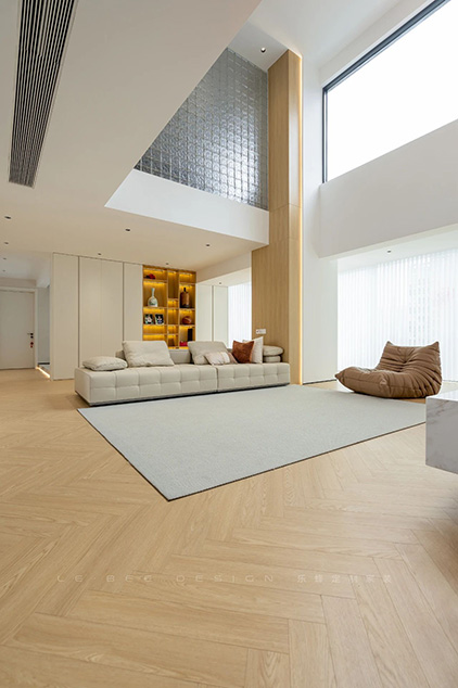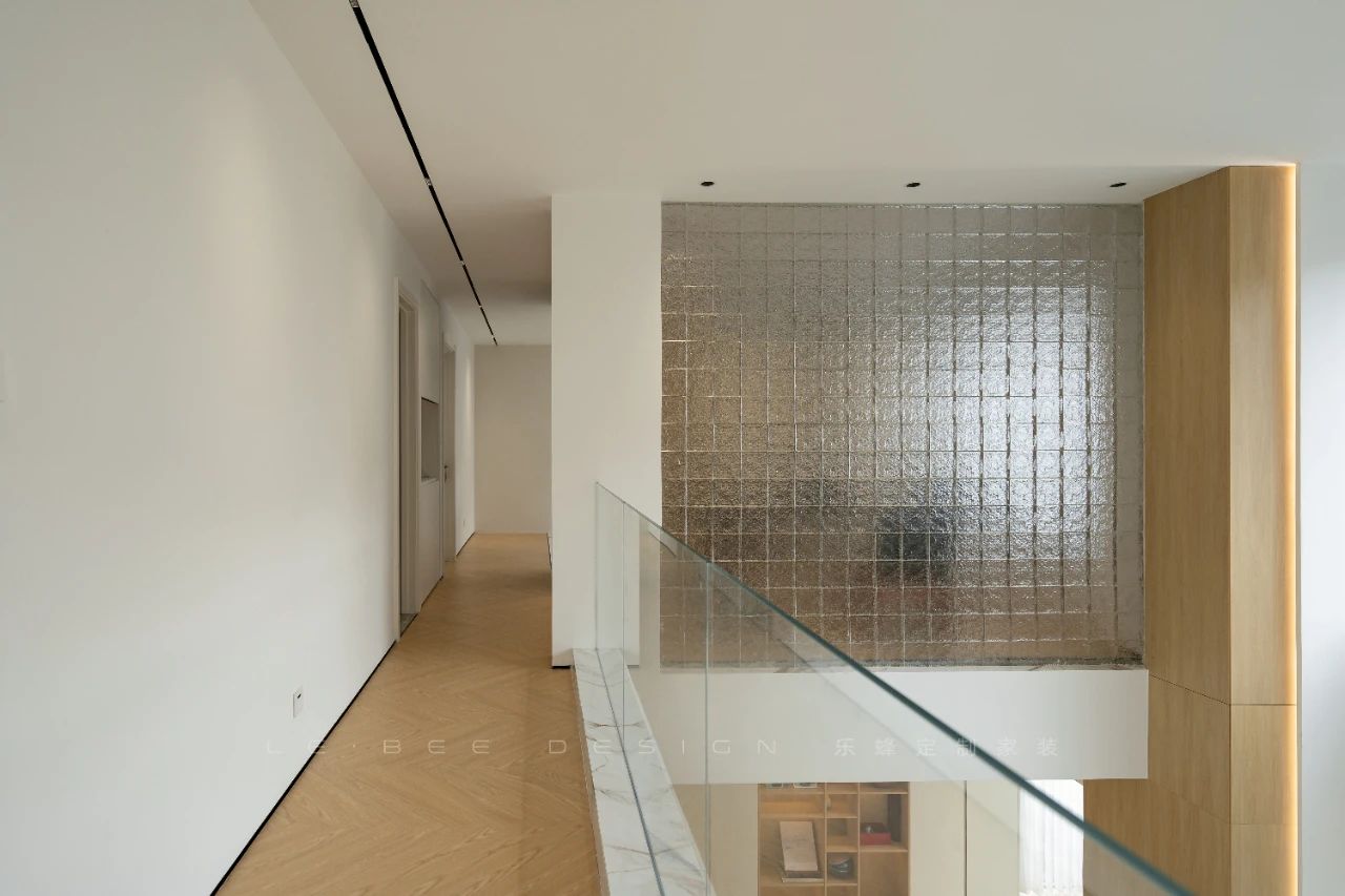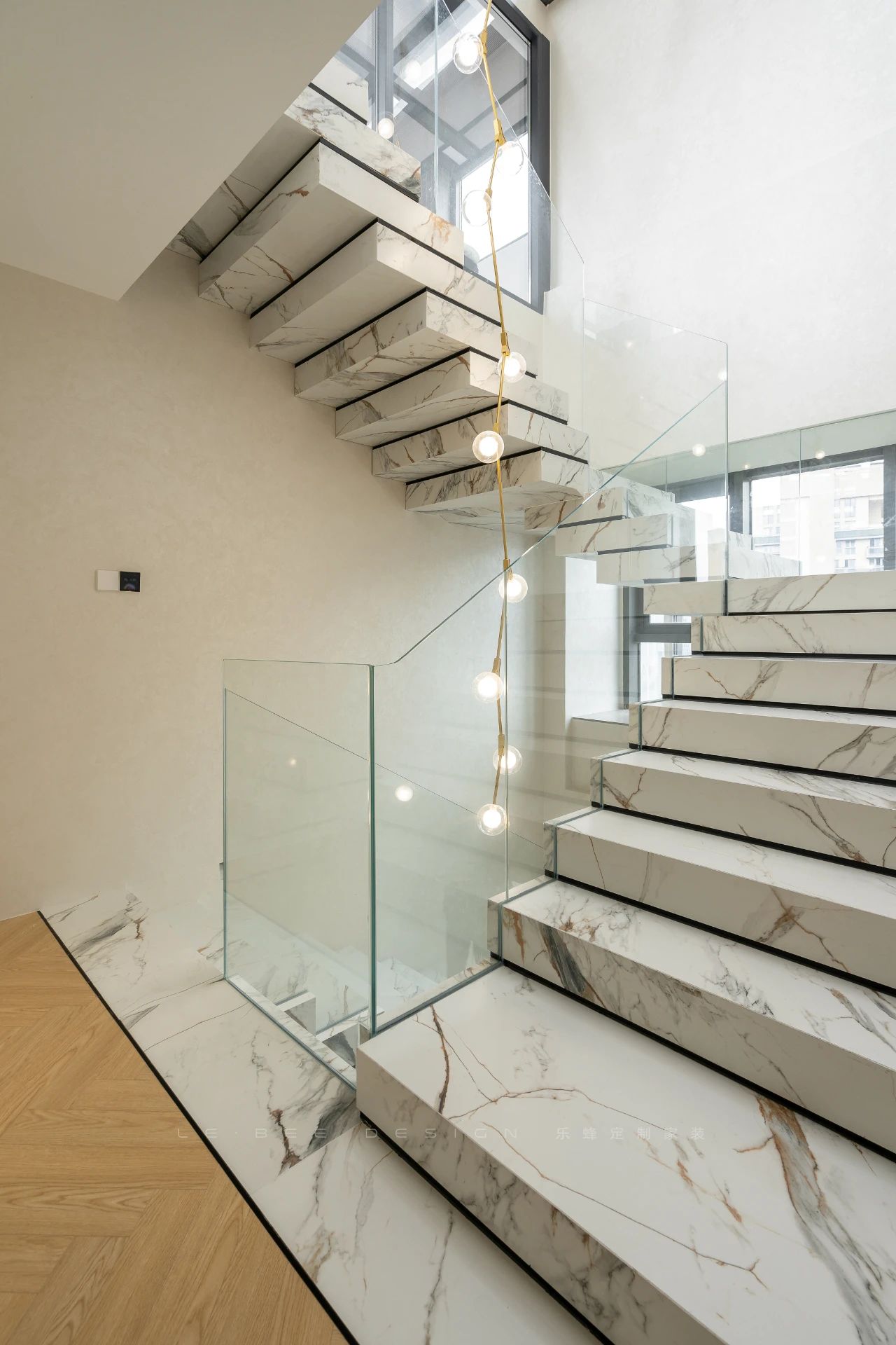 樓梯采用白色的巖板,搭配12厘米的超白鋼化玻璃。踏步立面采用白色的巖板,增加了空間整體的層次感,采用內(nèi)嵌卡槽的形式,以確保銜接和收口的完美,同時增強了承重能力。此外,提前預(yù)留了燈源,并采用了“光感+人體感應(yīng)”的設(shè)計,實現(xiàn)了“人來燈亮,人離燈熄”的智能控制。在光線暗的情況下,燈感應(yīng)到人體,呈現(xiàn)出層層梯進的追光效果,既照亮了樓梯,又提升了美感。
