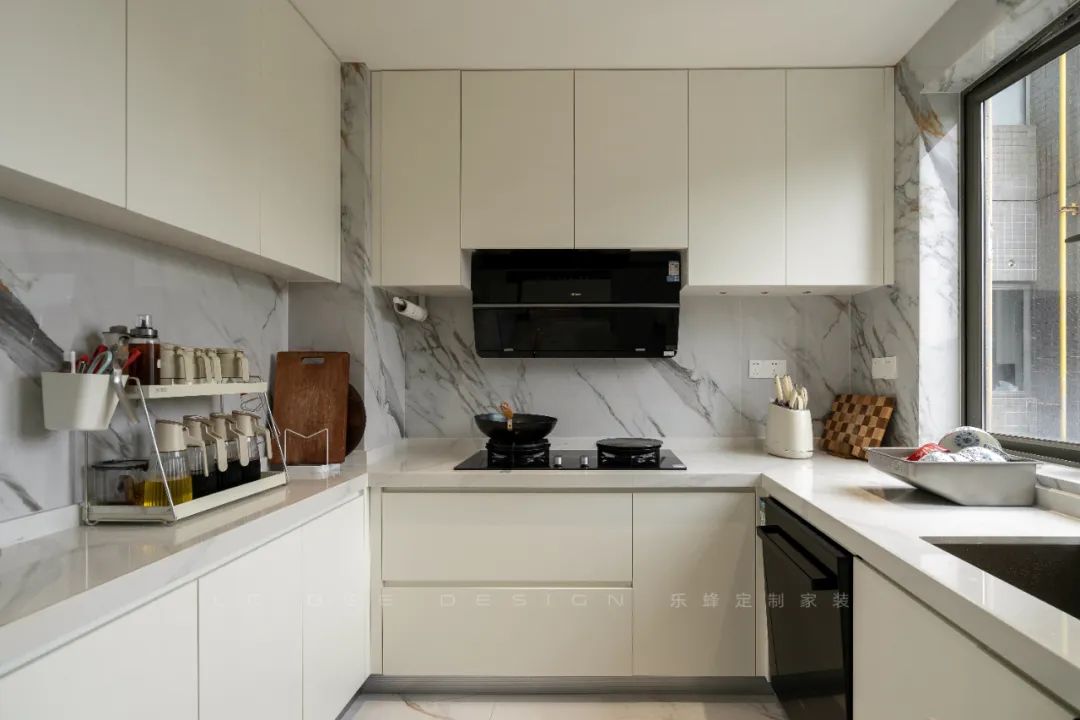 廚房選用了U型布局,頂部全線吊柜采用米白色門板,中央置入油煙機,使廚房空間展示出潔凈與雅致。下部的U型設(shè)計將煮菜區(qū)、洗滌區(qū)和儲藏區(qū)巧妙隔離,有機劃分功能場所,讓廚房工作線路更加明晰有序。