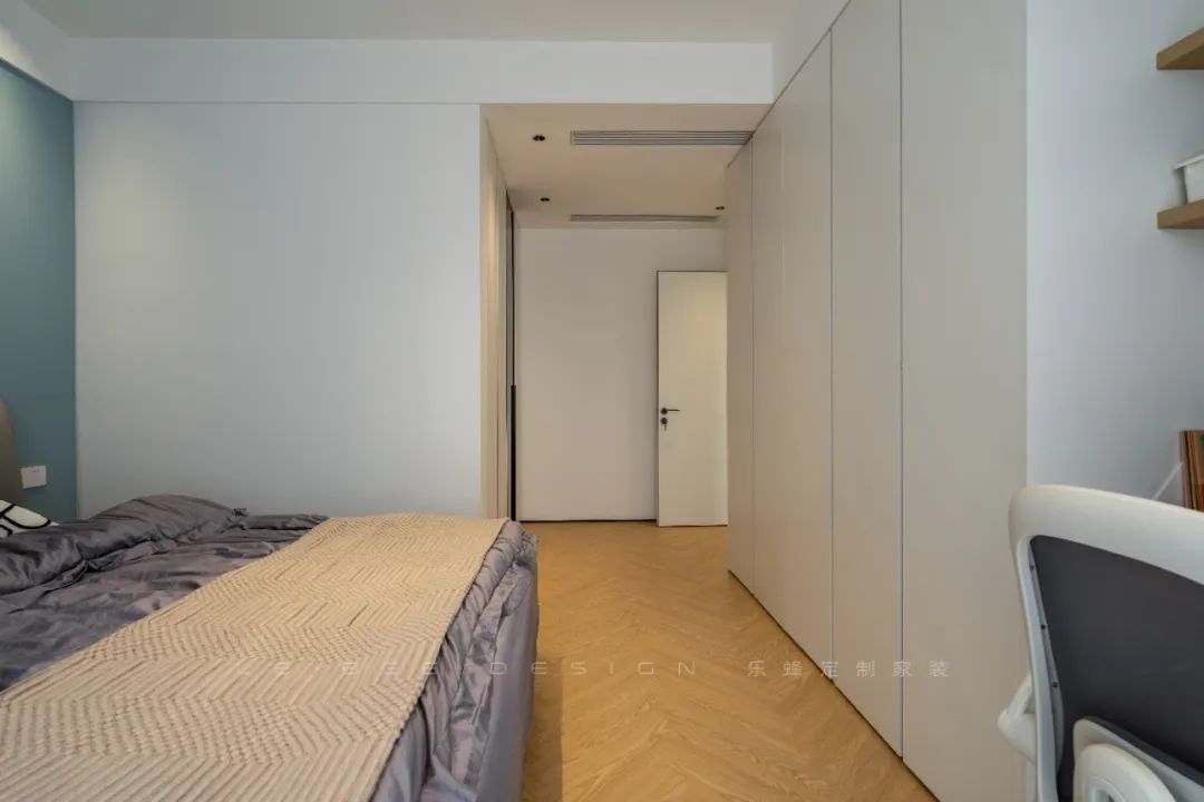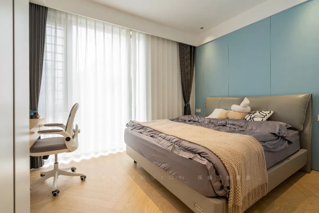 進門右側(cè)是一門到頂?shù)囊鹿瘢院啙嵈蠓降拿装咨耖T設(shè)計,充分利用空間,提供了豐富的存儲選項,同時為整個房間增添了清爽的視覺效果。男孩房以清新舒適的藍色背景墻和簡約的單眼皮吊頂為特色,搭配現(xiàn)代風(fēng)格的成品床及淺色系床上用品,展現(xiàn)出精心設(shè)計的空間感。此外,特別設(shè)計了實木懸浮書桌,為空間增添了自然的元素,讓整個空間更加溫馨舒適。