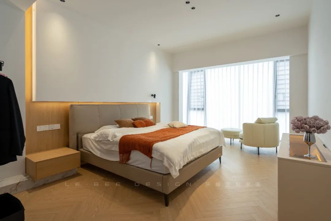 臥室采用無主燈設(shè)計,射燈主要用于重點照明,吊燈則用于裝飾空間,而燈帶則為氛圍燈光增添溫馨氣氛。床頭的護墻搭配線性燈提升了整體高級感。傳統(tǒng)的床頭柜被取消,木作大多以原木色為主,背景墻采用凹凸設(shè)計,原木巖板上墻并嵌入燈帶,增強了空間的層次感。床品以淺色為主,簡潔舒適。休息區(qū)的設(shè)計以黑白棕色為主調(diào),突顯出房間的高級質(zhì)感和品味。床尾玩鬧的小貓裝飾細節(jié)則為整個空間注入了一絲趣味與活力,使人們在休息時感受到更加舒適和愉悅。主衛(wèi)以大面積的大理石灰為主基調(diào),展現(xiàn)出飽滿的質(zhì)感和高級感。冷色系與暖色燈光相得益彰,營造出舒適宜人的氛圍。洗漱區(qū)采用木質(zhì)浴室柜搭配智能鏡柜,美觀大方,同時抽屜式和開放式儲物設(shè)計豐富了洗漱區(qū)的收納空間。干濕分離設(shè)計采用長虹玻璃隔斷,實現(xiàn)了空間的合理利用和功能分區(qū)。