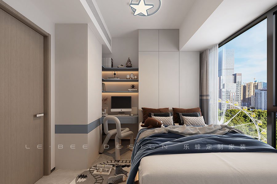 陽光正好寬敞的窗戶,讓陽光灑滿每個角落;舒適的床鋪,是每天甜蜜夢境的起點。墻面采用了柔和的色彩,營造出溫馨舒適的氛圍。地面則可能選用了啞光磚鋪上地毯毫無違和感,既增加了腳感舒適度,又提升了室內的質感。書架不僅提供了充足的儲物空間,還成為了一個展示個人品味和興趣的小天地,內嵌線性氛圍燈燈烘托房間高級感。書桌與衣柜做拼色,杏色與藍色色彩相互呼應,形成了一種和諧統一的視覺效果。