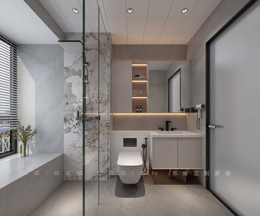 天花板上的主燈和嵌入式燈具,選用了與整體色調相協調的銀色或白色,既保證了照明效果,又使整個空間看起來更加和諧統一。淋浴區采用了玻璃門進行隔斷,不僅方便了清潔,也保證了視覺上的通透性,讓衛生間看起來更加寬敞。