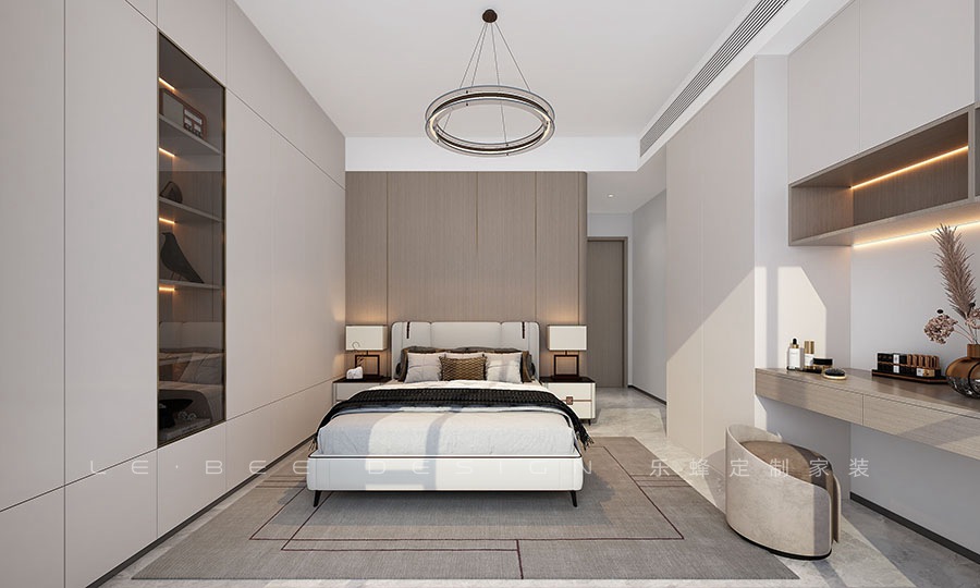 寬敞的空間與明亮的窗戶相映成趣,整個空間通透明亮,自然光線的透入讓臥室充滿了生機與活力。墻板木飾面襯托暖暖的氛圍感,整排全頂衣柜做裝飾柜隔斷,通過裝飾柜增加主臥觀賞性,化妝臺做懸空設計,提高空間設計感。為了增添一些層次感,你可以在床頭柜上擺放幾本經典的書籍,或者一個小綠植,讓空間更加生機盎然。此外,可以選擇一款簡約的吊燈或者壁燈來點亮整個房間,給你一個溫暖的讀書角落。