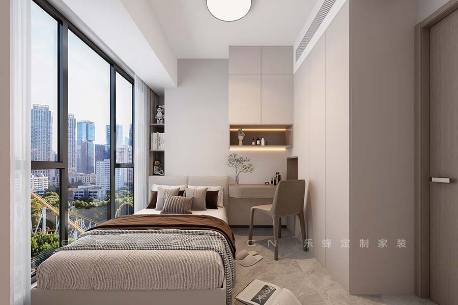 故技重施,靠窗擺放床,床頭背景墻做內嵌擺放柜,同時一側做懸空書桌和通頂柜一體化設計視覺上看起來更干凈,書桌上方做頂柜,底部做鏤空設計,上下平行做線性燈裝飾點綴,做圓弧處理防止起床時意外受傷。