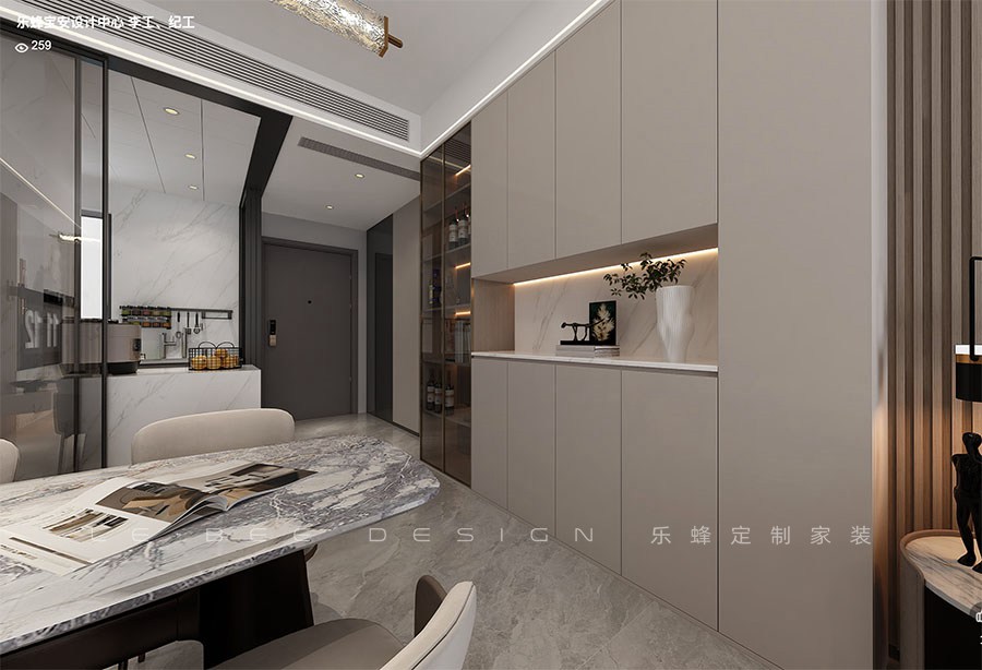 餐客相連,盡顯大宅通透感,廚房做吊柜玻璃門設計,通透明亮同時還不留衛生死角,廚房墻延伸全頂柜,增加收納功能的同時,提高空間的縱深感,裝飾柜做內嵌式燈帶,凸顯高級氛圍感。餐邊柜的整體設計體現了實用與美觀的完美結合,餐邊柜做鏤空設計,柜體采用優質材料打造,質地堅固且耐用,能夠經受住時間的考驗。酒柜設計考慮裝飾以及收藏的用途,做了玻璃裝飾門,內嵌線性燈做裝飾,打造出獨特的餐邊柜氛圍。