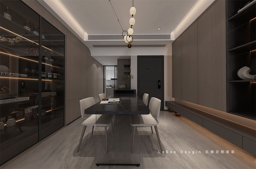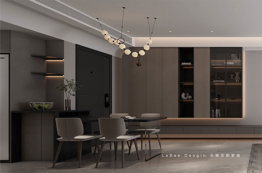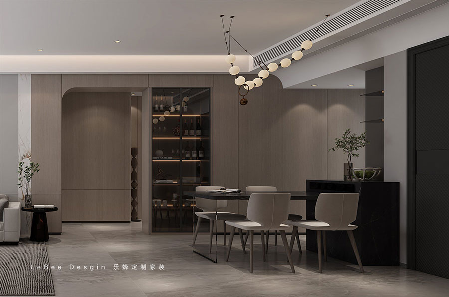 餐廳的主色調以黑和灰為主,營造出清新自然氛圍的同時,不僅要考慮功能的交互,還應注重情感的交流。一旁沉重墻則設計L型水吧臺,不僅豐富了功能,也增強了家居的互動感。在材質上,選擇木制烤漆柜門和藝術涂料可以提升家居的質感。深桃木色的餐邊柜不僅滿足了收納空間的需求,還使空間線條更加簡潔利落。