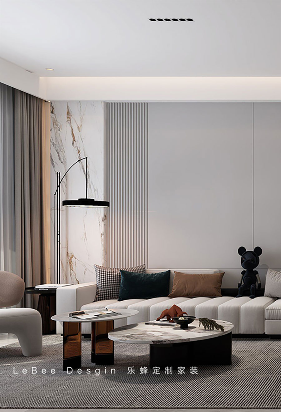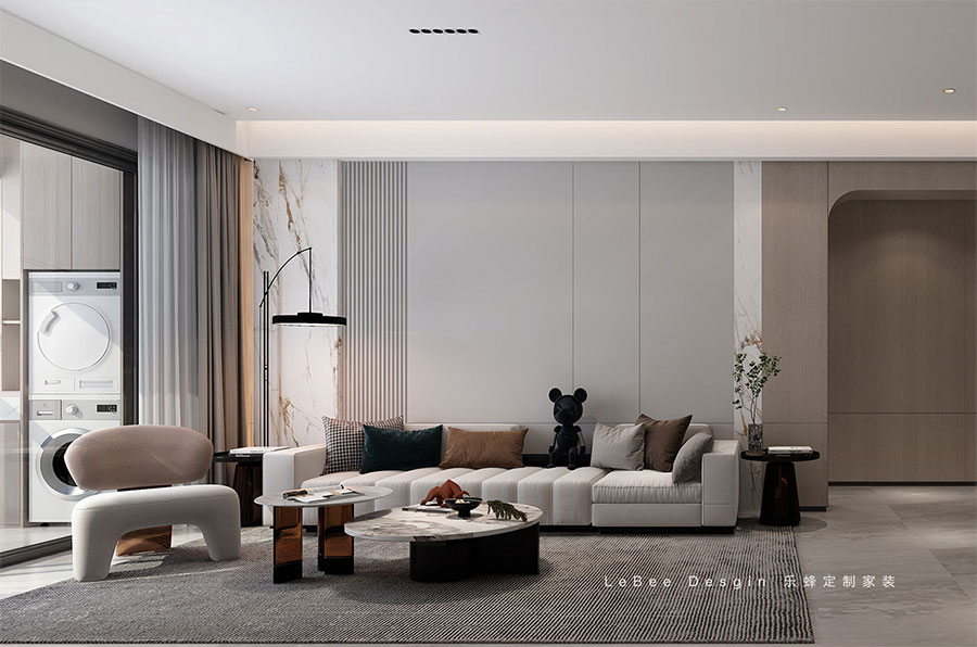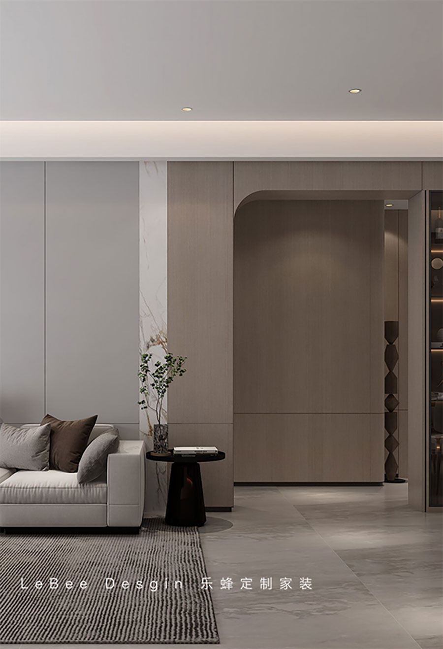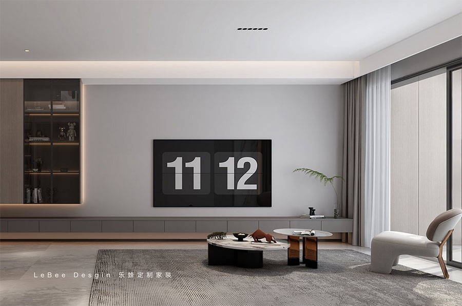 設計師為業主精心打造的黑白灰色調的家居設計不僅能夠帶來愉悅,更能夠提升生活品質,令人心懷感激和滿足。家是人生的港灣,而設計則是讓這個港灣更加舒適、更加美好的關鍵。主人期待的生活,以及設計師的審美,被表現在低飽和度的灰色調中,為建筑的肌理帶來溫潤的觸感。柔和的線條勾勒出空間的細節,展現了簡約風格的不張揚、不俗氣的特質。在純粹的美感中,空間呈現出更多的包容力。客廳與餐廳互通,擴大的空間成就更舒適的布局。一側設計客廳休閑區,藝術茶幾搭配成品沙發讓家更具互動交流感。電視背景墻沒有做過多的裝飾,通刷淺灰色的乳膠漆、定制懸浮電視柜、嵌入線性燈裝飾,考慮到頂面的橫梁不美觀則采用懸浮吊頂的設計,嵌入線性燈帶,提升整個空間的延伸感的同時,也很好的隱蔽了梁的不美觀。沙發背景墻通過對不同材質的巧妙拼接與轉換,呈現出一種唯美的極簡精致感。活潑的簡易裝飾悄然插入其中,成功地以簡約的美感凸顯其設計亮點,無形中開啟了設計的無盡可能性。客廳的另一側打造了一排懸浮式收納柜和展示柜,既增加了收納空間的同時,也兼顧了家居美學的需求。在簡約的家居設計中,不僅僅是簡化,而是通過簡潔、純粹的形式,實現了最符合家居功能需求的設計理念。