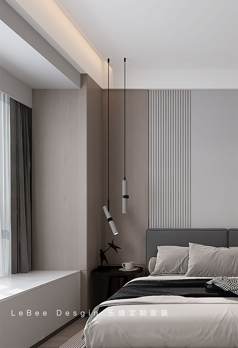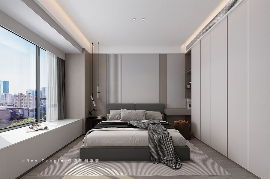 空間功能的差異意味著所需的氛圍也各有不同;主臥的設計更加著重于溫馨感。以米白色為主調,整體墻面采用木飾面與淺色墻板的搭配,使得材質一致,裝飾簡約大方。懸浮吊頂營造出溫馨的空間氛圍,讓整個空間回歸到最放松最舒適的狀態。