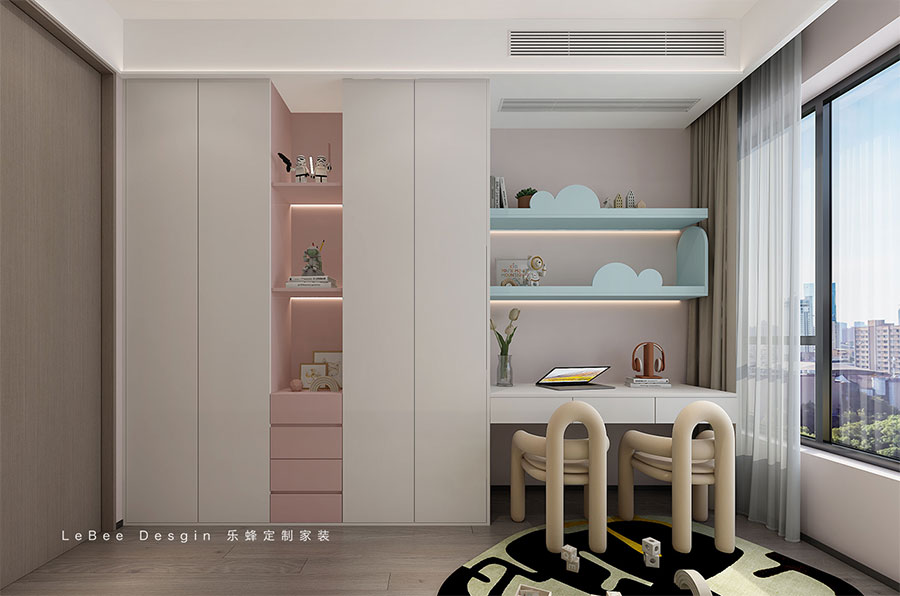 兒童房的設計注重了收納與實用,一門頂至地的收納柜與懸浮書桌完美結合,為孩子提供了充足的儲物和學習空間。粉色與藍色的巧妙碰撞,搭配著優雅的木紋磚,營造出充滿設計感與高級氛圍的兒童樂園。