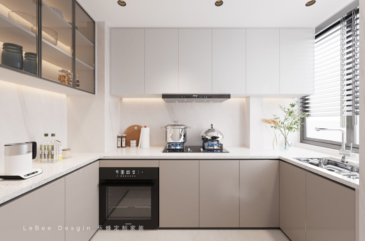 整體廚房呈現U型格局,置物收納合理布局,井然有序。蒸烤箱、冰箱等家電內嵌,利用率更高~膚感柜門搭配白色巖板臺面,簡單搭配更符合現代人的審美,免拉手設計,一眼清爽干凈。