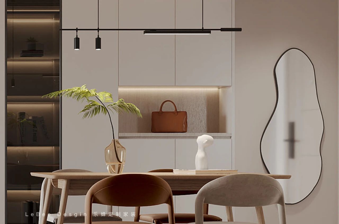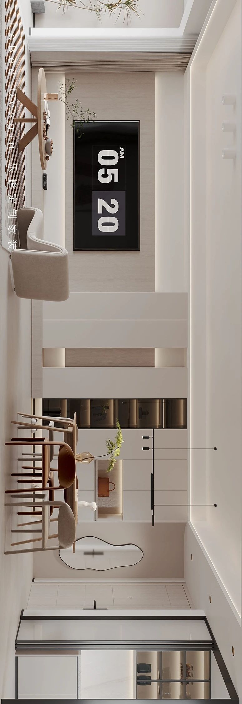 全開放的客餐廳布局,整體色調以淺色和奶油色為主,空間通透干凈,不執著于過多的裝飾,采用線性燈的設計,簡約又有層次感,低飽和度的色彩給人溫馨舒適的感覺,同時還是可以上鏡出片的ins治愈系屋宅。電視背景墻的顏色延續了客廳的奶油色調,使得整個空間色彩統一,和諧美觀。電視采用內嵌式設計,使得墻面看起來平整簡潔,沒有過多的突出物。下方鏤空內嵌燈帶,不僅增加了收納空間,還提升了整體的層次感,使電視背景墻更加美觀實用。淺色系沙發和米色地毯的搭配使得整個空間氛圍溫馨而舒適。奶油色調作為主基調,更增強了這種輕松愉快的氛圍,營造出一個宜人的居家環境。拆除陽臺推拉門融入客廳,陽臺打通做落地窗,公共區域更加開闊明亮,使整個空間充滿著生機勃勃的氣息。洗烘機內嵌進陽臺柜,美觀不占地。