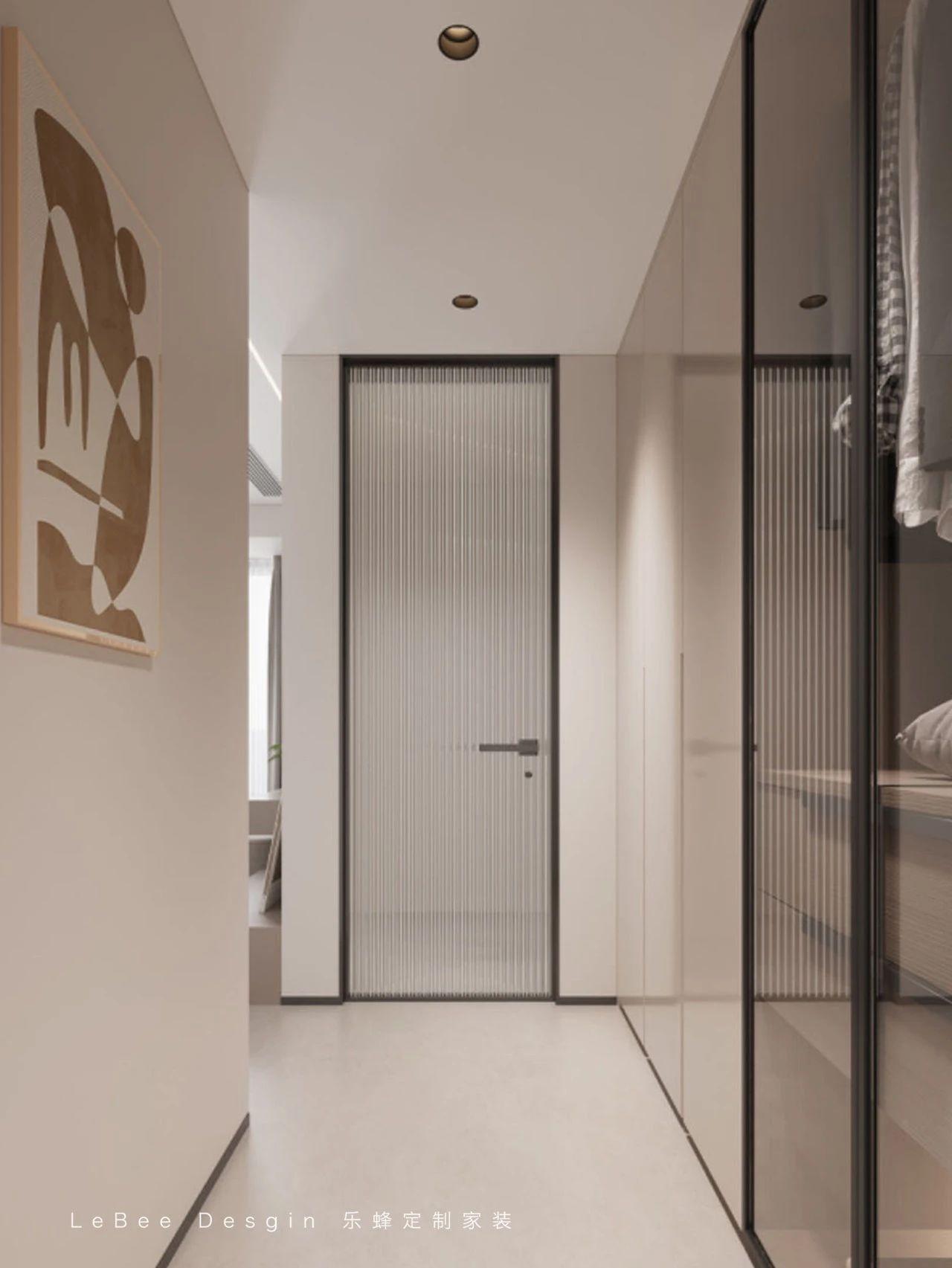 進入主臥,就是超級寬敞的開間,我們巧妙利用過道區域,一側做滿墻柜,一側掛上掛畫增加藝術感,空間利用率超高,玻璃柜門搭配暖色燈帶,更顯明亮敞闊內部分設掛衣區、疊放區。