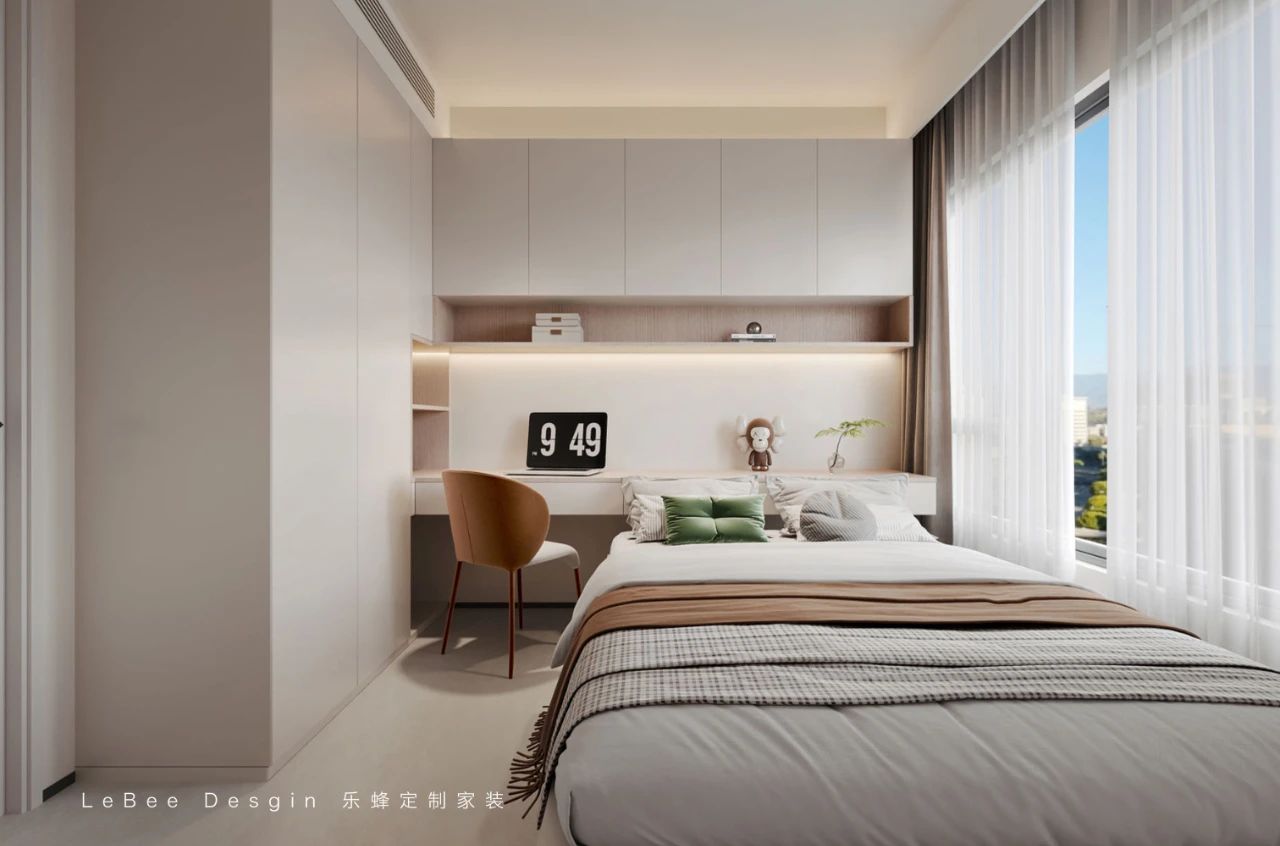 次臥整體配色是淡淡的奶油色系搭配,暖白為主,咖色點綴空間,溫馨又治愈。靠床上方是儲物柜,平常不使用的衣服或者生活用品都可以收納起來,衣柜書桌床頭一體設計,吊柜下方嵌入暖光燈帶,營造溫馨氛圍。