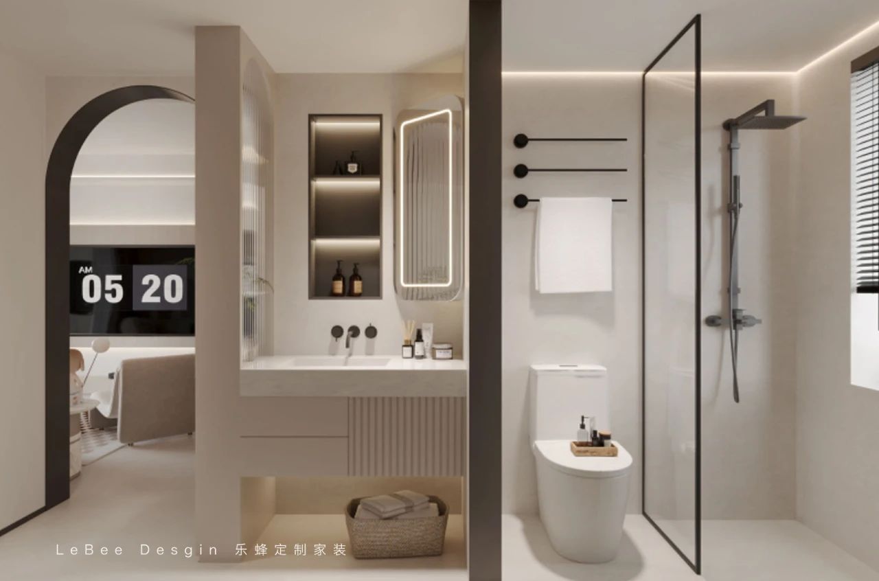 公衛拱門設計顏值超高!干濕二分離的浴室洗漱區外移做了半開放式的,好看又實用;選擇了懸掛式的浴室柜搭配智能浴室鏡+開放格設計,科技感滿滿!