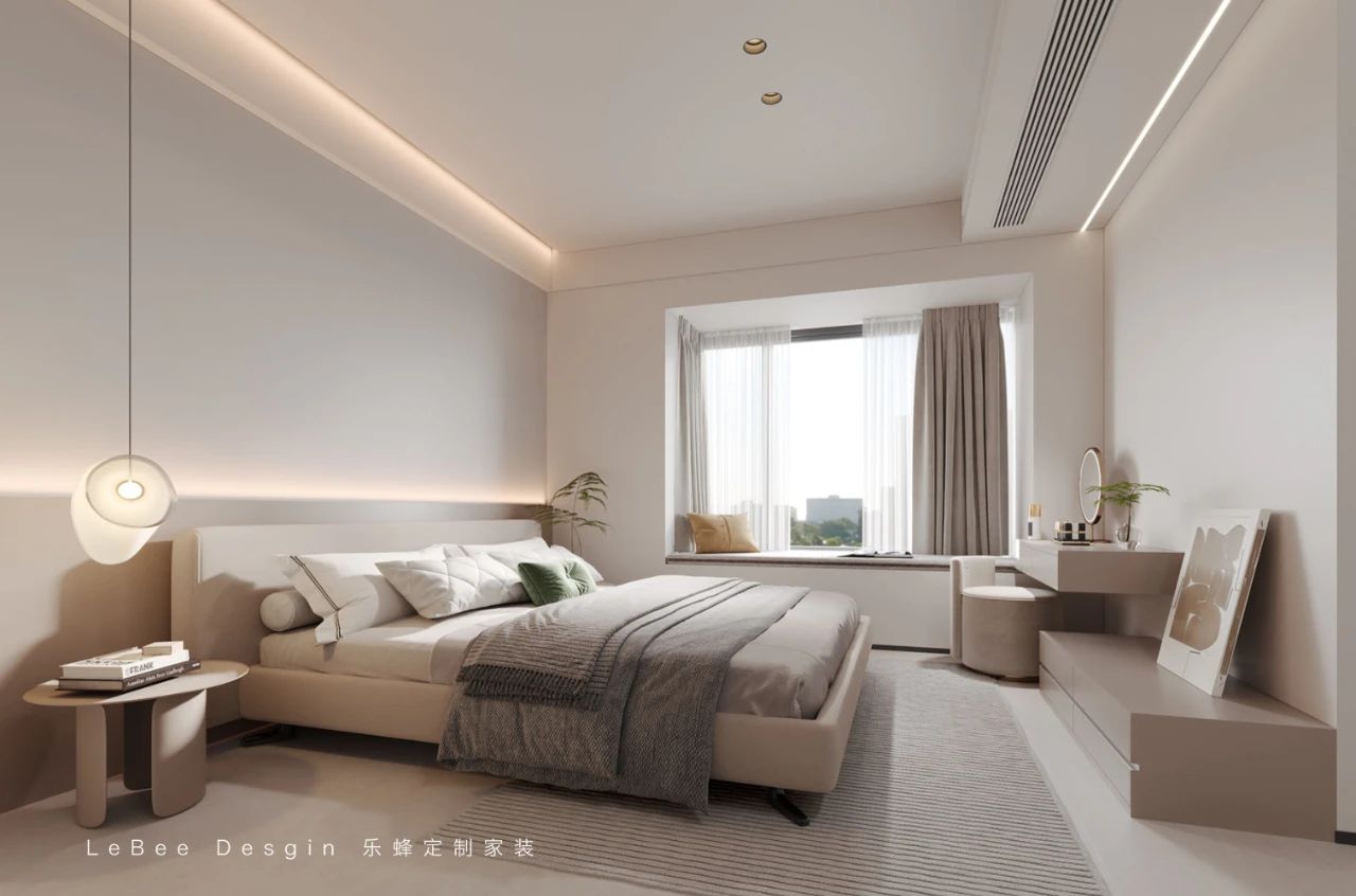 臥室的設計注重溫馨靜謐的氛圍營造,配色簡約而不失質感。低飽和度的奶油色給人一種溫柔的放松感,確實營造了一種柔和而寧靜的氛圍,墻壁、柜體和床鋪都是同色系,使得整個空間更加和諧統一,視覺上也更加流暢。