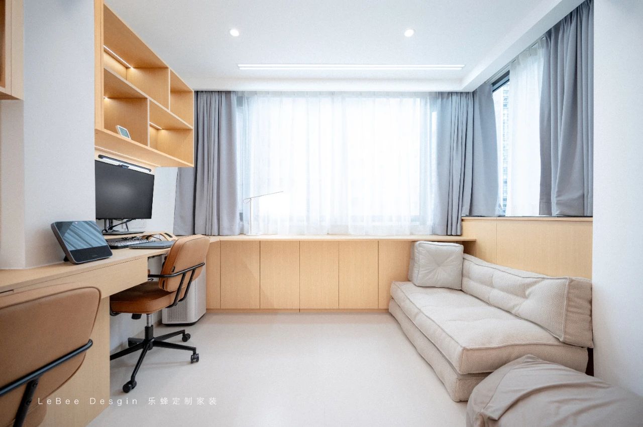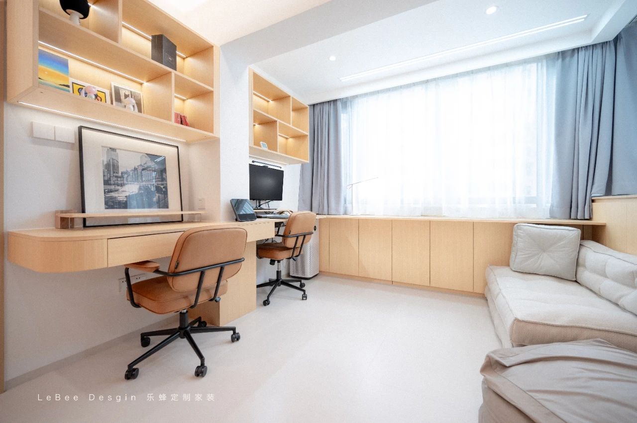 客廳空間則延續整體設計重點收納,專門打造了兩張懸浮書桌,與之相搭配的吊柜,真是將簡約與實用完美結合,既簡潔有序,又超級能裝。
